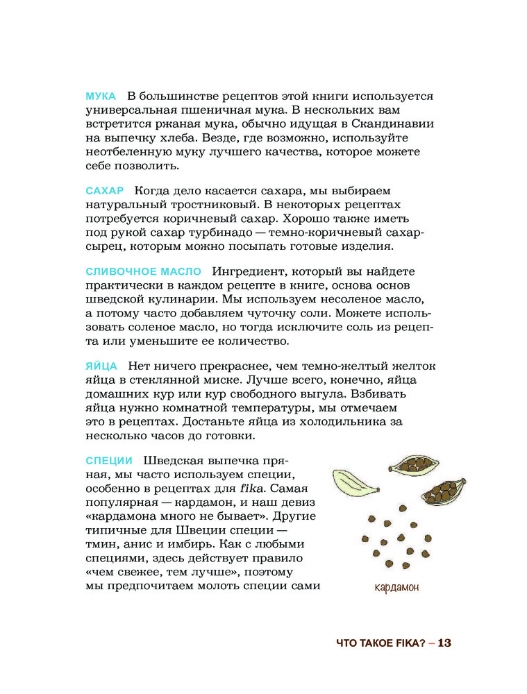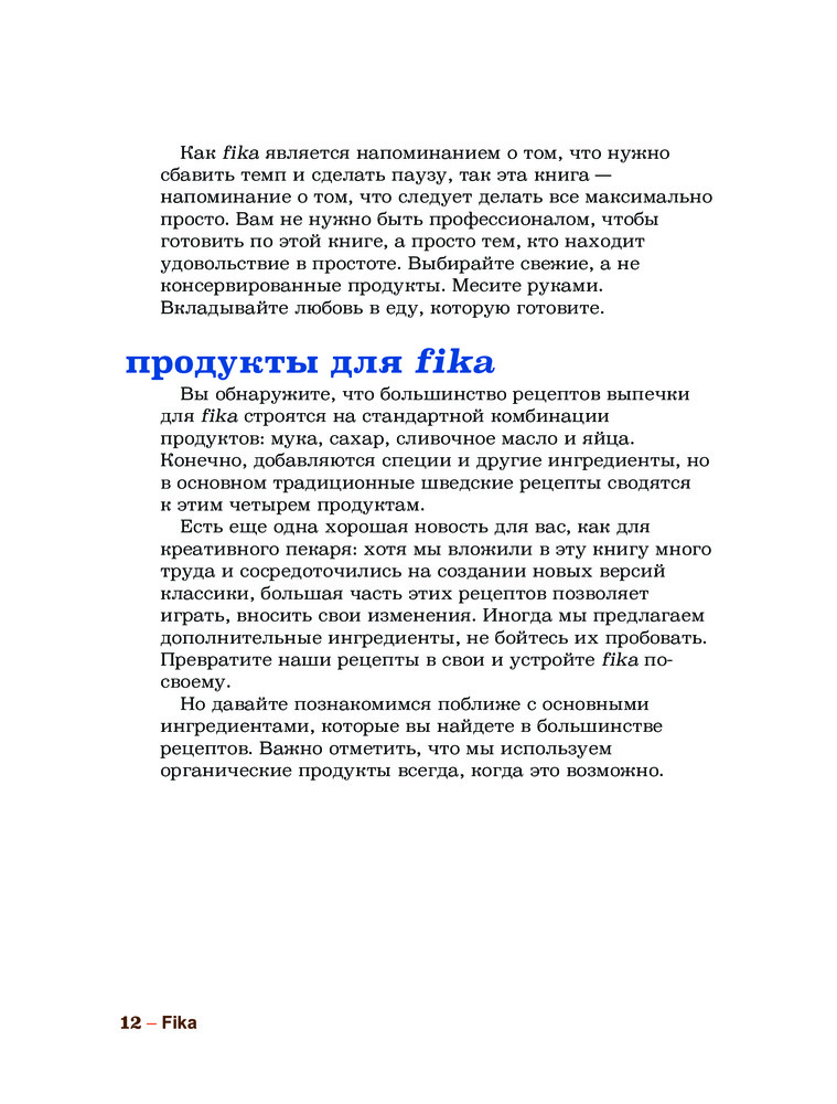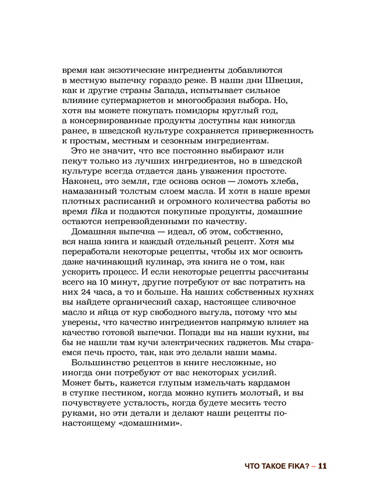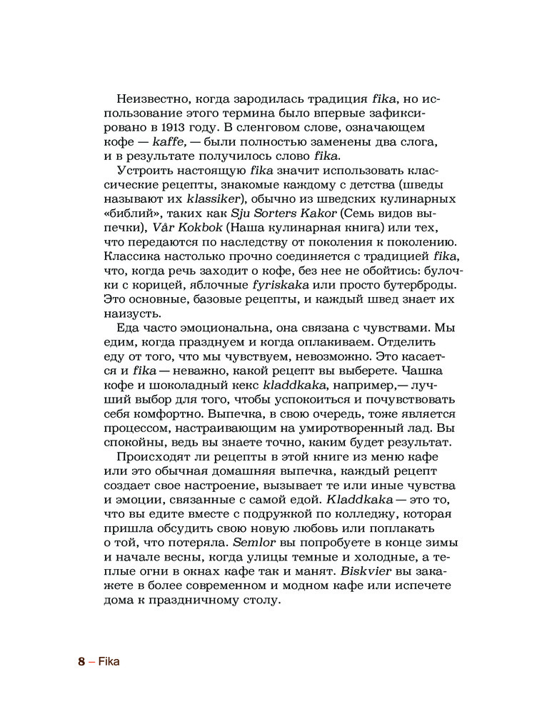 • fika — нечто особенное; она подходит к любому моменту и сезону. Вы выбираете, что съесть во время fika, в зависимости от того, какую атмосферу хотите создать. Об этом читайте в рецептах книги.