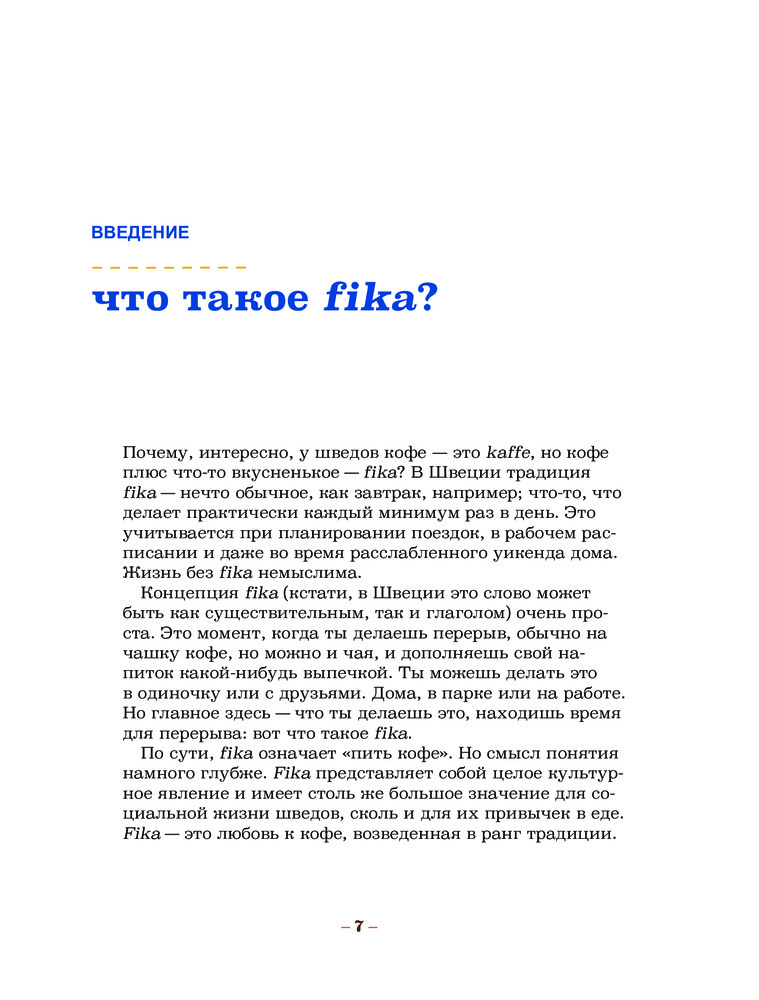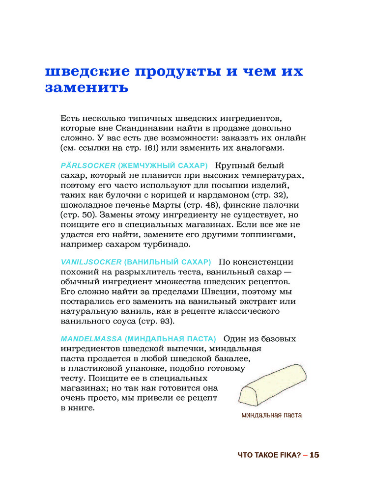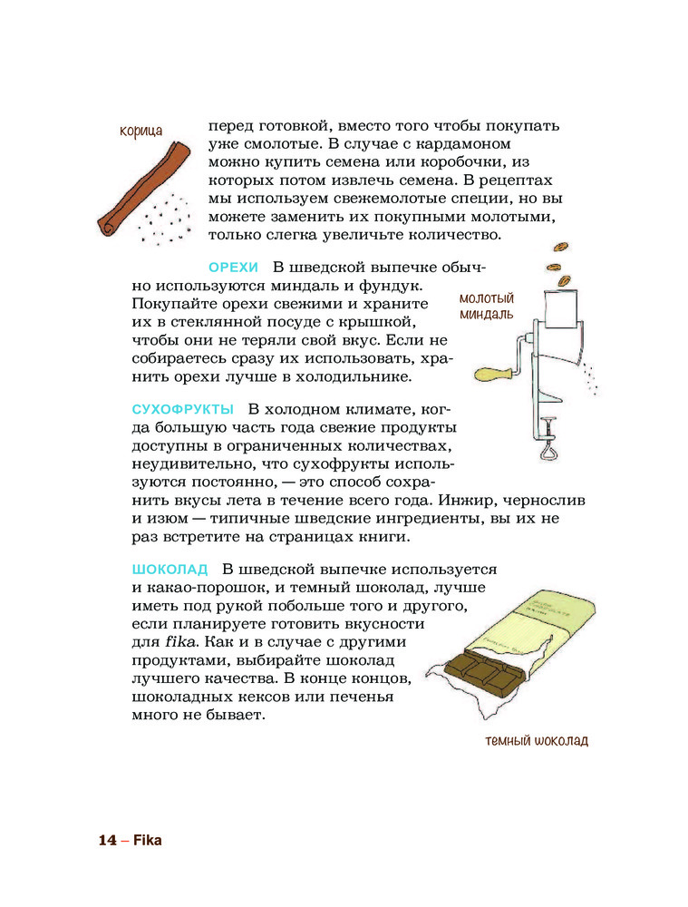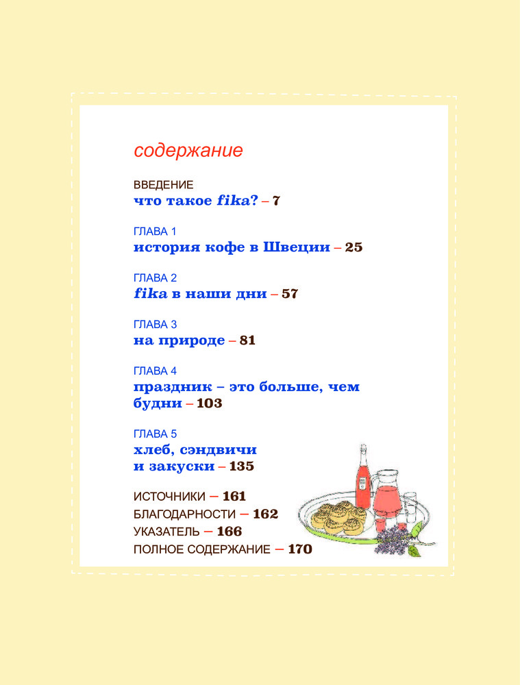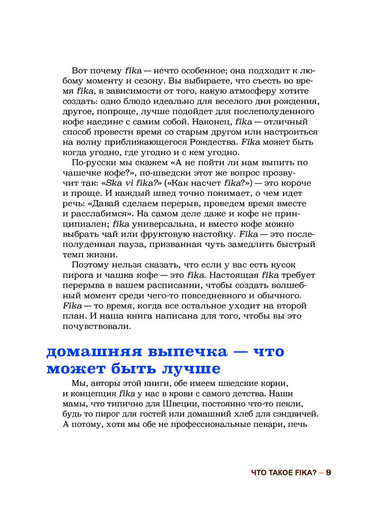 • fika — нечто особенное; она подходит к любому моменту и сезону. Вы выбираете, что съесть во время fika, в зависимости от того, какую атмосферу хотите создать. Об этом читайте в рецептах книги.