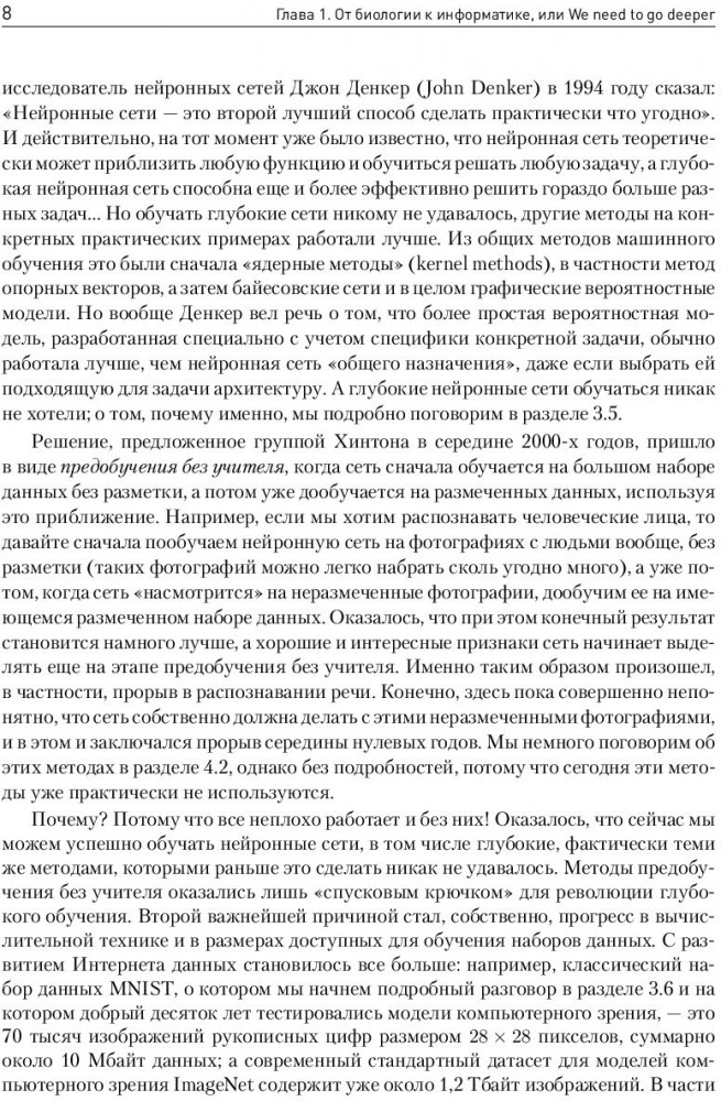 Очень крутая книга! Для тех, кто хочет начать свой путь в нейронные сети, но либо лень, либо не хватает навыков чтения на английском, очень хороший вариант. Написано интересно, с многочисленными отсылками и историями. Автор проделал великолепную работу. MUST READ!