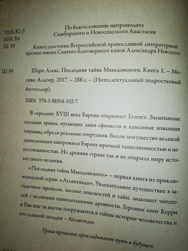 Последняя тайна Македонского. Книга 1В данный момент этот товар отсутствует в продаже. Возможно, у нас найдется аналогичный или похожий товар здесь. Начало увлекательной серии для семейного чтения, рассказывающей о великих цивилизациях древности. Это увлекательное путешествие в загадочное прошлое, полное опасностей и тайн. Главные героини — сестры-подростки Керри (Екатерина) и Ева — ищут пропавшего отца, учёного-археолога, оказавшегося в ловушке тайного лабиринта. Благодаря старинному фолианту девочки переносятся в Древний Египет. Они становятся свидетелями важных исторических событий и раскрывают одну из самых интригующих загадок истории. |