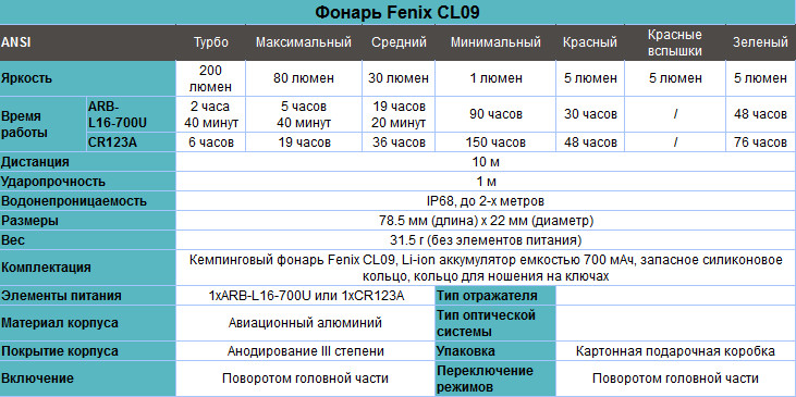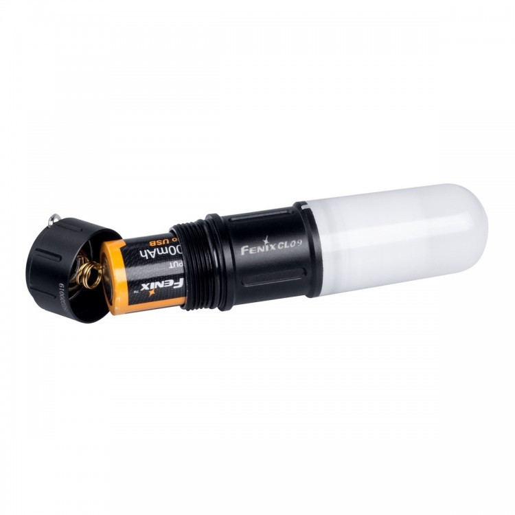 Питание фонарь Fenix CL09 получает всего от одной батарейки. По умолчанию в комплект входит аккумулятор 16340 на 700 мАч фирменного производства Fenix. Это качественный элемент питания, рассчитанный на многократную повторную зарядку. Примечательно, что заряжать его можно не только в стандартном зарядном устройстве (оно продается отдельно от фонаря), но и через кабель USB. Соответствующий порт встроен непосредственно в корпус элемента питания. Энергии такого аккумулятора достаточно на поддержание работы фонаря в течение 2-90 часов.