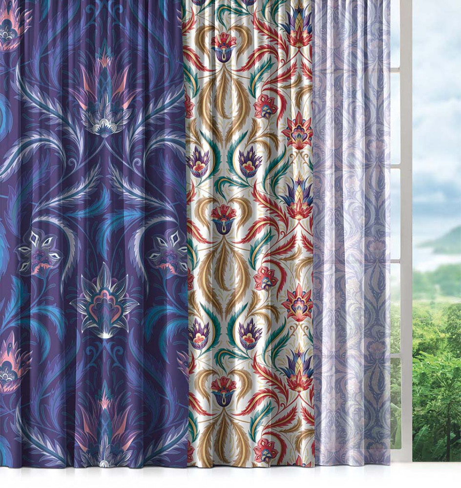 • гармонично подобранное сочетание для разных тканей — красивое и функциональное решение. Можно регулировать освещенность комнаты за счет штор разной светопроницаемости. Рисунок компаньона и основной шторы идеально дополняют друг друга, не нужно искать и подбирать;