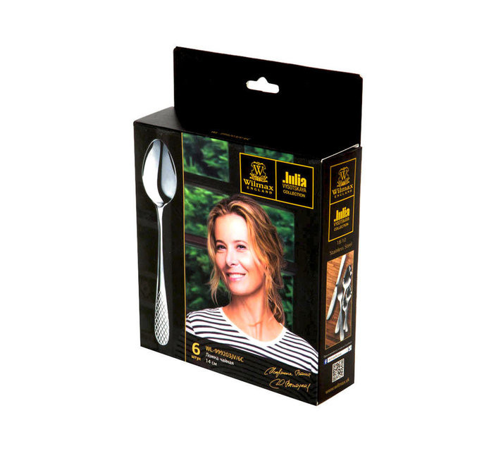 Wilmax Ложка чайная «Stainless steel» (14 см, 6 шт)В данный момент этот товар отсутствует в продаже. Возможно, у нас найдется аналогичный или похожий товар здесь. Серия: Коллекция Юлии Высоцкой Wilmax презентует новую коллекцию столовых приборов, призванных элегантно подчеркнуть любое блюдо на вашем столе. Они изготовлены из высококачественной нержавеющей стали марки 18/10. Приборы Wilmax прочны и устойчивы к коррозии, деформации и притуплению. Они абсолютно безопасны и не изменяют вкусовые качества, запах и цвет пищи, так как не вступают в реакцию с ее компонентами. Легко моются, сохраняя при этом яркий, привлекательный внешний вид, а также подходят для посудомоечных машин. |