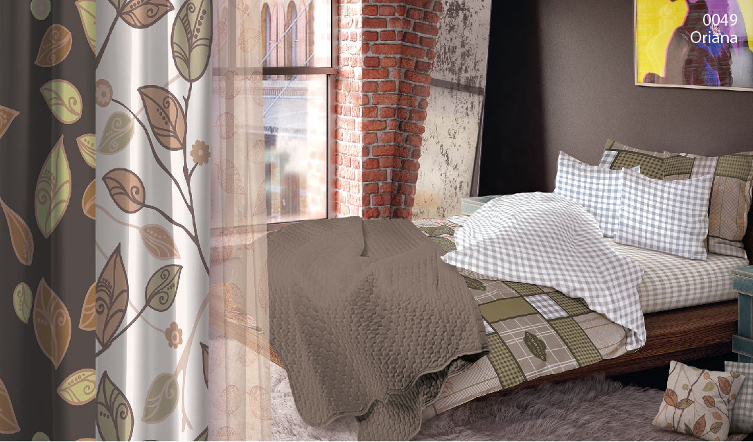 Очень сдержанный и при этом очень теплый комплект, использующий природные цвета: оттенки коричневого и светло-зеленого, бежевый, белый. За счет такой гаммы прекрасно подходит для большинства интерьеров, но будет интересно смотреться и в контрастных тёплых сочетаниях.