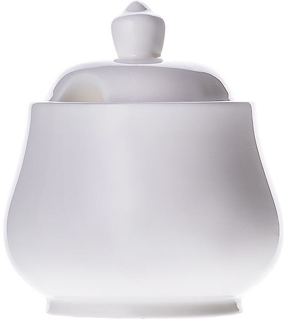 Очень красивая небольшая сахарница. Фарфор белый, без всяких оттенков. Простая, ничего лишнего.