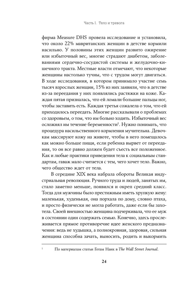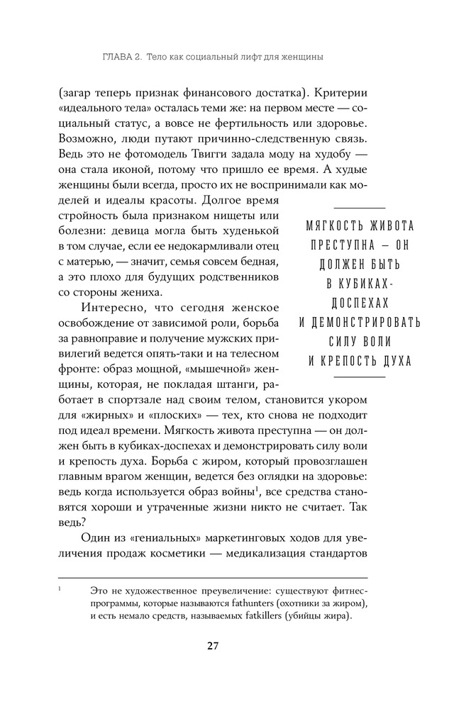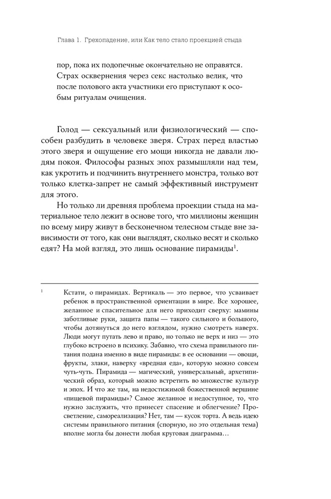 Книга must read для современной женщины. То, что нужно чтобы поставить на место мозг, задолбаный интернетом на тему еды и тела. Не помню, чтобы за последние лет 15 меня настолько захватывала книга, что я прочитывала ее за полдня, не отрываясь. Эта такая. Считаю, что книга обладает терапевтическим эффектом. Читать всем, кто: - обеспокоен темой похудения, целлюлита и отсутствия плоского живота - устал постоянно переживать на тему того, что можно, и что нельзя есть - без или с переменным успехом пытается перейти на правильное питание - имеет претензии к себе и своему телу по поводу неидеальности - переживает что у всех в интернете все получается, и "только со мной что-то не так". Меня очень впечатлила, наконец-то, есть что-то подобное на русском языке. Много ссылок на статьи, книги и исследования других авторов. Местами очень эмоционально. В нескольких местах отсылки к христианской морали и цитаты из библии, листа три, наверное в общей сложности. Для меня не очень органично это информация вплелась, но кто в теме, наверное понравится.