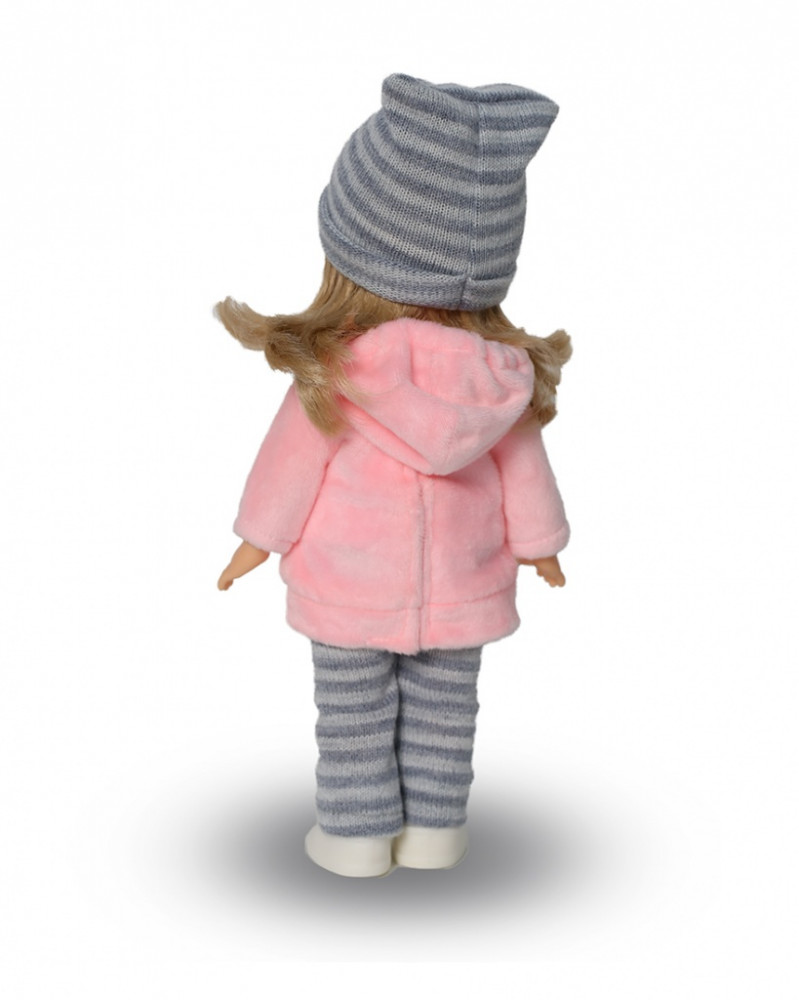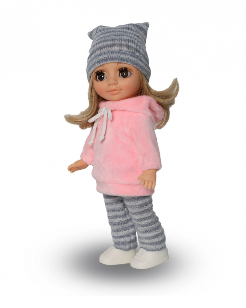 Хорошая куколка, не большая. Из одежды: трусики, маечка, носочки, туфельки, гамаши, толстовка, шапка. Ручки чуть помягче тела. Красивая, без запахов.