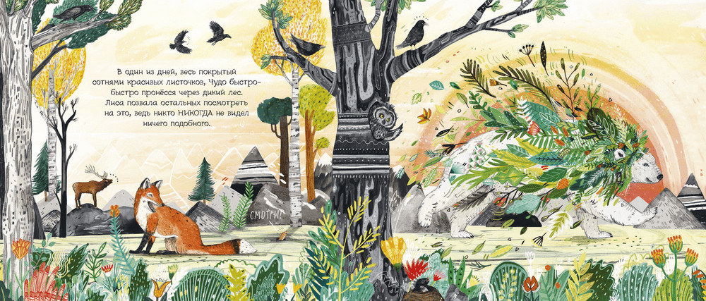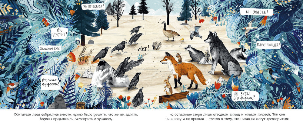 Много было написано про книгу и много было фото, которые я могла внимательно изучить. И на этих фото я прочитала текст и в нем я увидела очень важную тему, которую давно обсуждаю с сыном. Тема очень сложная для понимания ребенка и мне сложно ее ему объяснять. Это «спроси, прежде чем делать выводы». Вот и в этой книге наглядно видно, что зверям стоило поинтересоваться, что за существо появилось рядом с ними, откуда оно и они узнали бы, что бояться нечего, а наоборот - Чуду нужна помощь. И если бы Чудо заговорило с окружающими, то они не стали бы бояться, а могли бы подумать, как ему помочь. Автор наглядно показал, как обе стороны мучаются от незнания друг друга, надумывают каждый свои проблемы/страхи и мир стоит на месте. А стоило только заговорить – даже проблемы смогли решить, а не только перестать бояться. Помимо истории, книга завораживает практически «взрослыми» иллюстрациями. Аплодирую художнику – он наполнил иллюстрации теми деталями, которые мы не ждем от детской книжки. Получилось красиво.