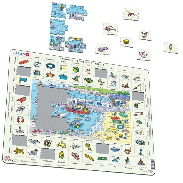 Larsen Обучающий пазл «Английский язык 3», 70 элементовВ данный момент этот товар отсутствует в продаже. Возможно, у нас найдется аналогичный или похожий товар здесь. Обучающий пазл «Английский язык 3», представленный производителем Larsen, является развивающей игрой, позволяющей ребенку выучить названия некоторых предметов, животных и действий. Элементы пазла собираются в картинку на картонном основании. В центре картинки изображен берег водоема с пляжем, к которому подплывают корабли. Ребенок сможет прочитать названия пляжных предметов, действия персонажей, нарисованных на картинке. По периметру центральной картинки проходит 2 ряд пазлов, которые нужно собрать, ориентируясь на надписи. Играя, ребенок легко запомнит английские названия предметов. |