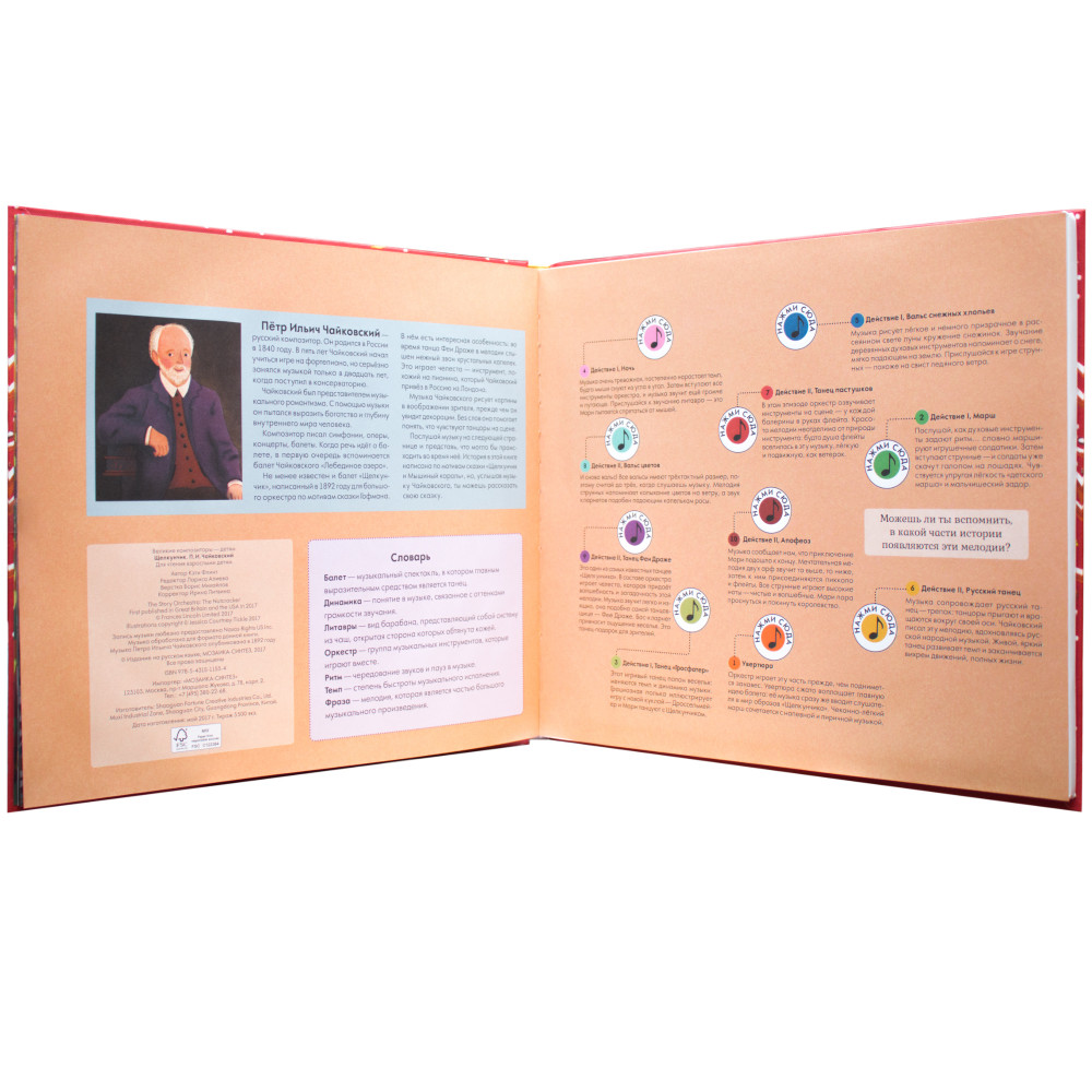 В конце книги ребенок найдет много интересного - биографию композитора, мини-словарь музыкальных терминов,  занимательные факты о произведении и 10 кнопок, нажав на которые, он сможет прослушать все мелодии еще раз.