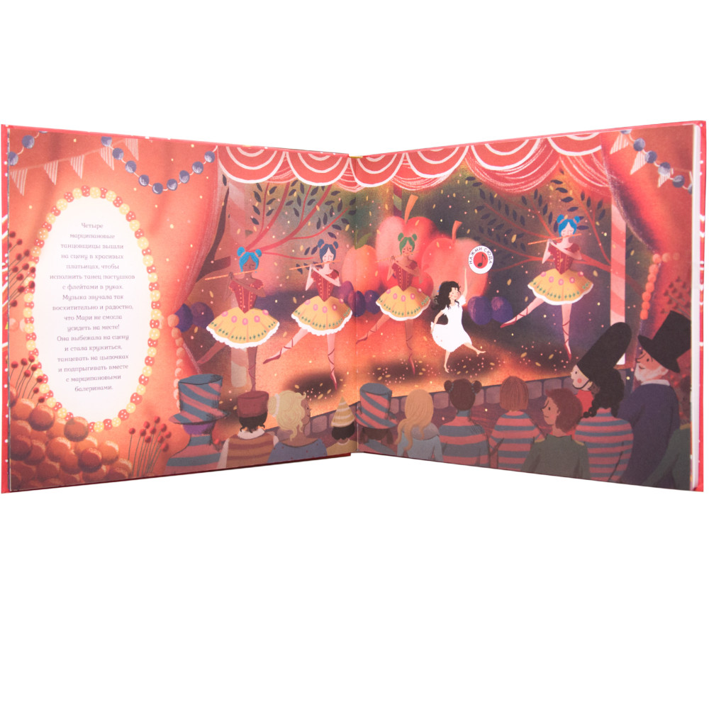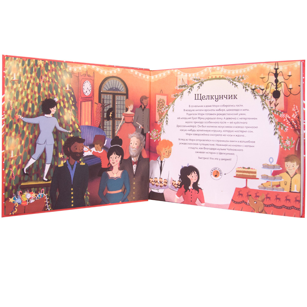 На красочных страницах перед маленьким читателем раскроется мир, полный волшебства и чарующих звуков музыки. Рассматривая потрясающие иллюстрации Джессики Кортни-Тикл, он вслед за Мари отправится в волшебное рождественское путешествие.  Нажимая на кнопки, ребенок услышит отрывки балета  Петра Ильича Чайковского  «Щелкунчик» - битва Щелкунчика и Мышиного Короля, танец Феи Драже и другие.