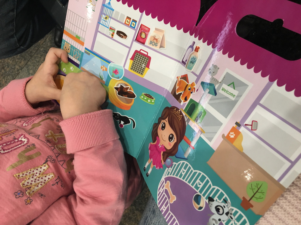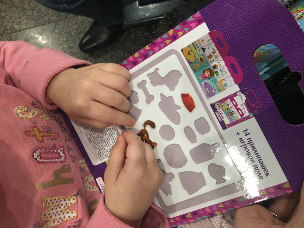 Отличный вариант, чтобы занять ребёнка в дороге. Наклейки, действительно, многоразовые, выполнены из толстой «резины». Само игровое поле в виде сумочки/книжки, из плотного, ламинированного картона.