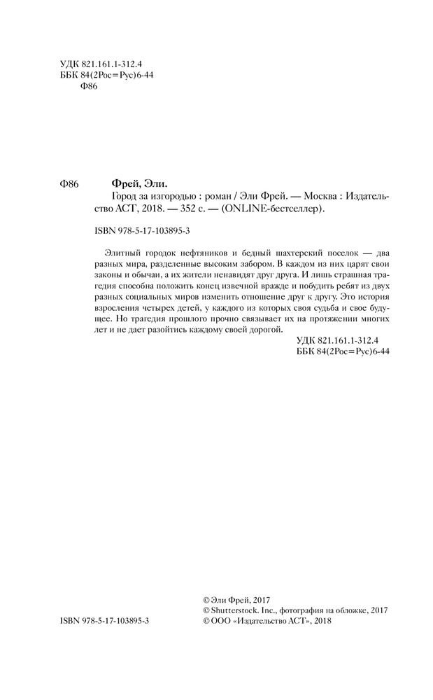 Город за изгородьюВ данный момент этот товар отсутствует в продаже. Возможно, у нас найдется аналогичный или похожий товар здесь. Серия: Online-бестселлер Элитный городок нефтяников и бедный шахтерский поселок — два разных мира, разделенные высоким забором. В каждом из них царят свои законы и обычаи, а их жители ненавидят друг друга. И лишь страшная трагедия способна положить конец извечной вражде и побудить ребят из двух разных социальных миров изменить отношение друг к другу. Это история взросления четырех детей, у каждого из которых своя судьба и свое будущее. Но трагедия прошлого прочно связывает их на протяжении многих лет и не дает разойтись каждому своей дорогой. |