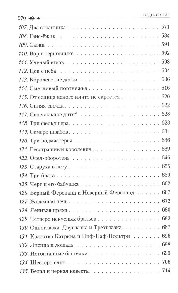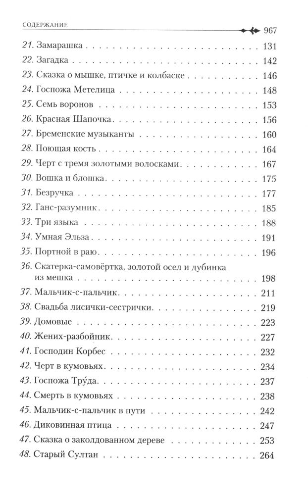 В детстве у меня была книжка сказок братьев Гримм, конечно, там были не все сказки, но эту книгу я затерла до дыр, пока она не развалилась:) Это издание само по себе уникально, потому что у нас редко издаются полные собрания сочинений в красивом оформлении, особенно сказочников, к тому же это издание соответствует последнему прижизненному изданию сказок братьев Гримм. В книге 200 сказок и 10 легенд, почти к каждой сказке есть черно-белая иллюстрация. В конце книги приводится краткая биография братьев Гримм. Книга напечатана на офсетной бумаге, шрифт довольно крупный. Всем советую приобрести эту замечательную книгу в свою библиотеку!