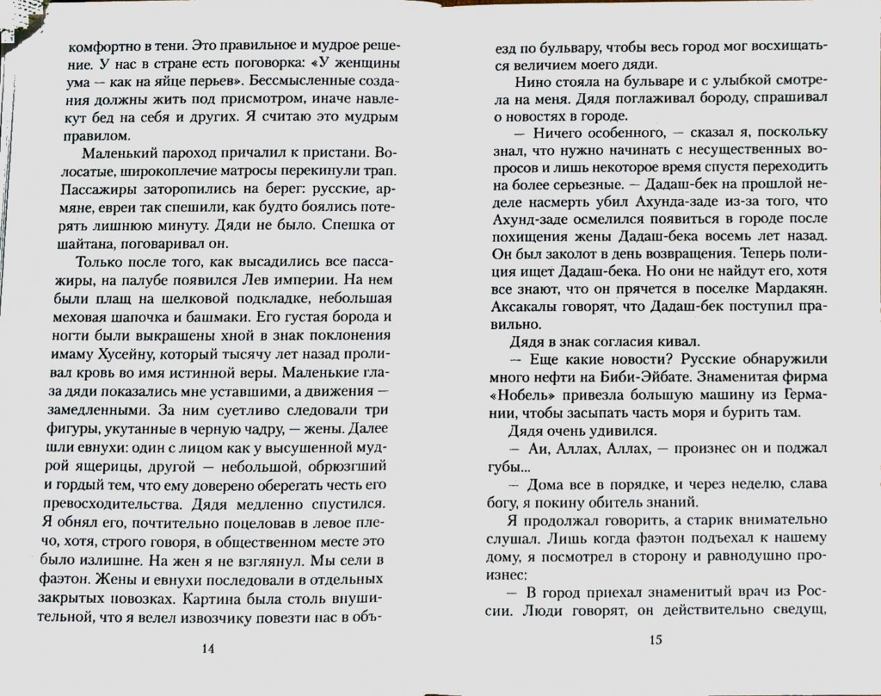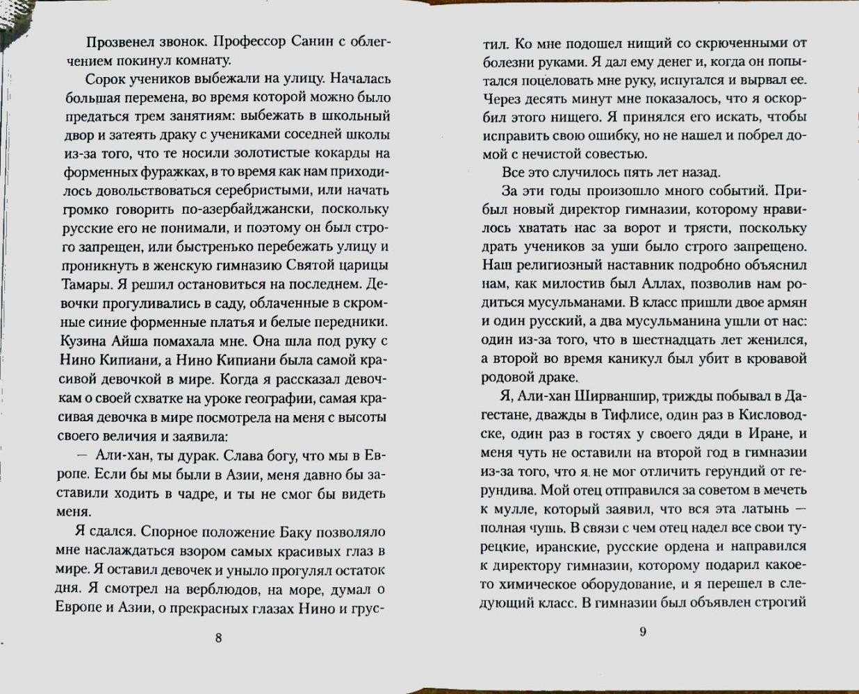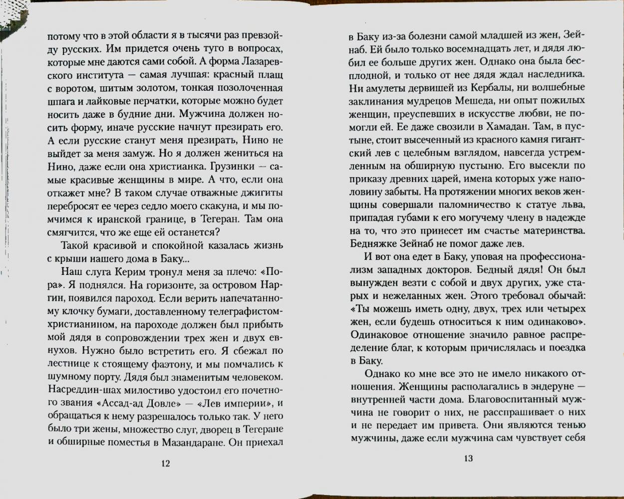 История любви мусульманина и грузинки. Трогательно описана и так правдиво. Я будто сама побывала в Азербайджане, Иране, Грузии и Дагестане. Огромная пропасть между культурой Запада и Востока, и Баку центр этих культур. Рекомендую к прочтению.