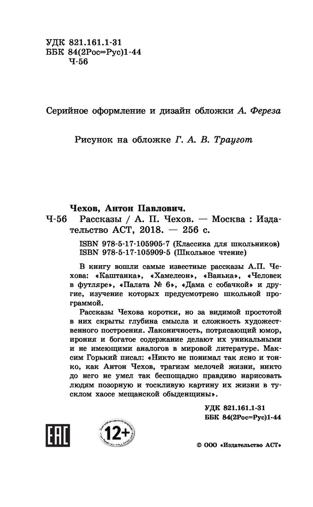 💳 Оплатить за товар можно при получении 🇰🇿 Есть бесплатная доставка по Казахстану от 1 дня 🎁 Копите бонусы с каждой покупки Серия: Школьное чтение В книгу вошли самые известные рассказы А.П. Чехова: «Каштанка», «Хамелеон», «Ванька», «Человек в футляре», «Палата № 6», «Дама с собачкой» и другие, изучение которых предусмотрено школьной программой. Рассказы Чехова коротки, но за видимой простотой в них скрыты глубина смысла и сложность художественного построения. Лаконичность, потрясающий юмор, ирония и богатое содержание делают их уникальными и не имеющими аналогов в мировой литературе. Максим Горький писал: «Никто не понимал так ясно и тонко, как Антон Чехов, трагизм мелочей жизни, никто до него не умел так беспощадно правдиво нарисовать людям позорную и тоскливую картину их жизни в тусклом хаосе мещанской обыденщины». |