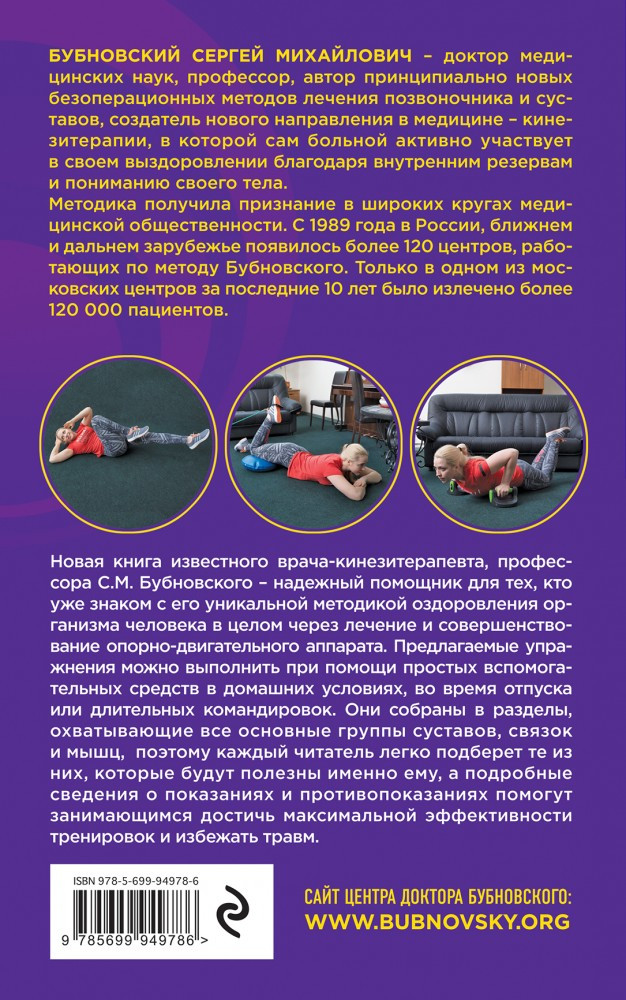 Новая иллюстрированная книга известного врача-кинезитерапевта, профессора С.М. Бубновского — надежный помощник для тех, кто уже знаком с его уникальной методикой оздоровления организма человека в целом через лечение и совершенствование опорно-двигательного аппарата, но по тем или иным причинам не может регулярно посещать специализированные Центры кинезитерапии с авторскими тренажерами.