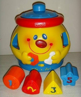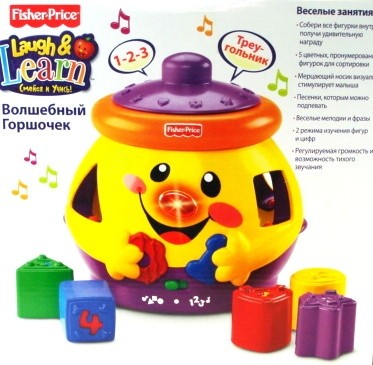 От этого волшебного горшочка в восторге вся наша семья!!! Малыш только с ней игрался целых 3 дня подряд... не брал в руки другие игрушки.. сразу понял какие фигурки куда вставлять и высыпал и доставал... Сразу начал называть фигурки и везде где увидит похожую форму (на паласе, на рисунке, в мультфильме и т.д.)- называет то "круг", то "квадрат"!!!! Ни разу не перепутал в горшочке куда вставляется та или иная фигурка!!!!Восторг!!! Яркая! Крепкая! Интересная! Я бы только громкость добавила!!! Не пожалеете, если купите ребенку такую игрушку!!!