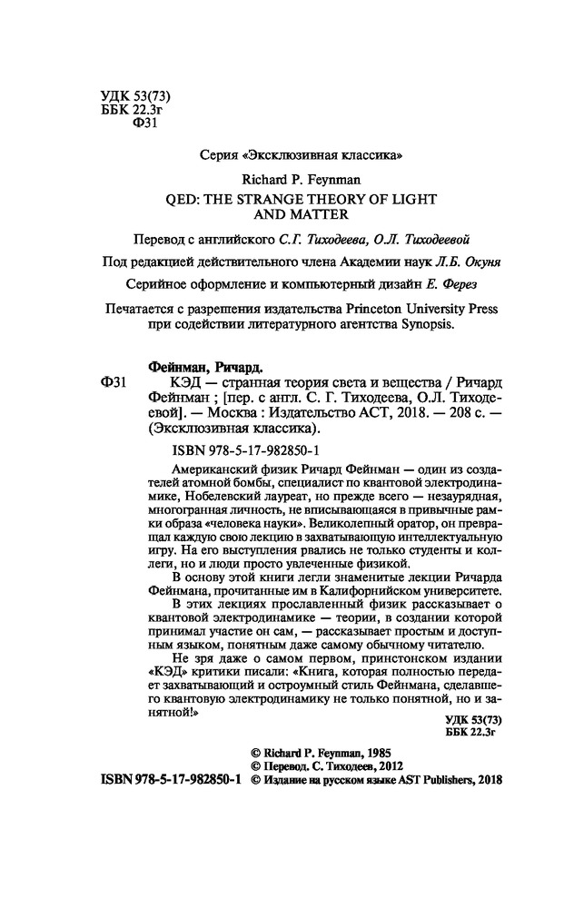 Серия: Эксклюзивная классика Американский физик Ричард Фейнман — один из создателей атомной бомбы, специалист по квантовой электродинамике, Нобелевский лауреат, но, прежде всего, — незаурядная многогранная личность, не вписывающаяся в привычные рамки образа «человека науки». Великолепный оратор, он превращал каждую свою лекцию в захватывающую интеллектуальную игру. На его выступления рвались не только студенты и коллеги, но и люди, просто увлеченные физикой. |