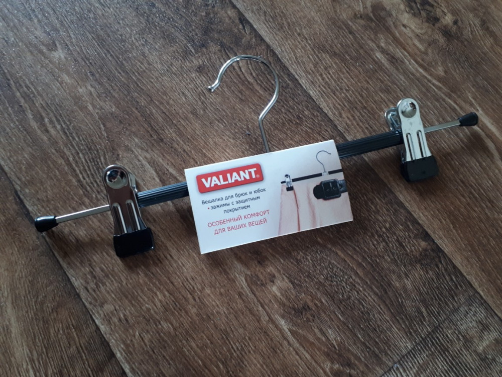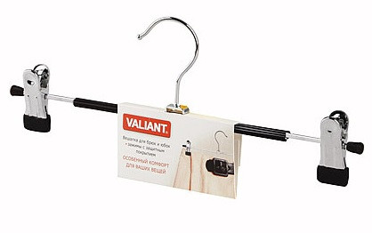 В данный момент этот товар отсутствует в продаже. Возможно, у нас найдется аналогичный или похожий товар здесь. Серия: Вешалки металлические Удобная вешалка для брюк и юбок. Зажимы с защитным покрытием. VALIANT - особенный комфорт для Ваших вещей!