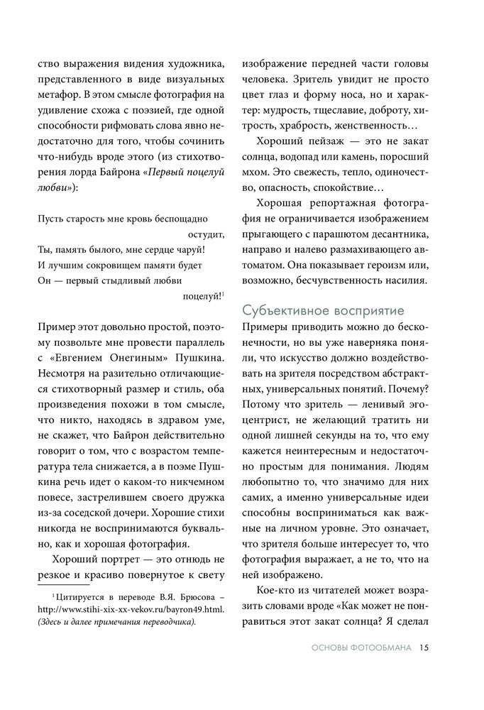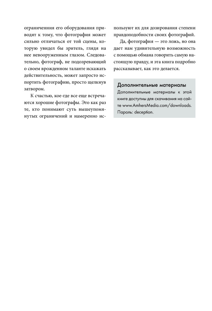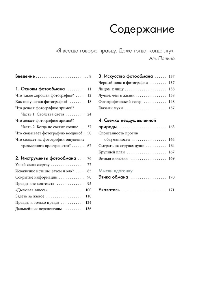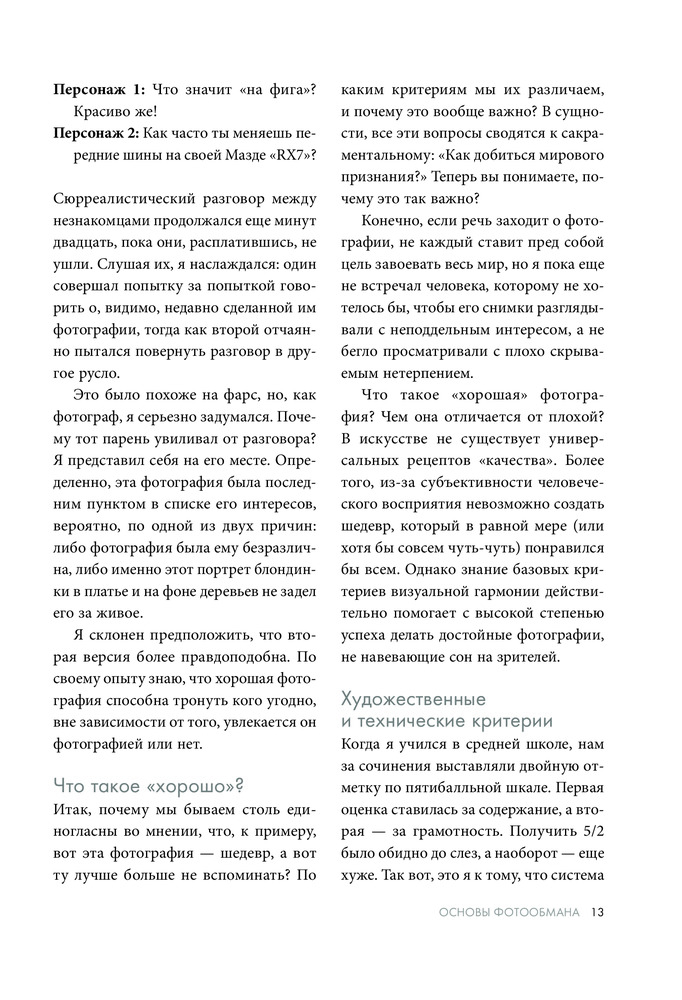 Он расскажет секреты своего мастерства: как маэстро обманывает взгляд зрителя, цепляет его. Как сделать хороший портрет, как шутить посредством фотографии, расскажет про метод Хальсмана и Аведона. Книга будет интересна как профессионалам, так и начинающим фотографам.