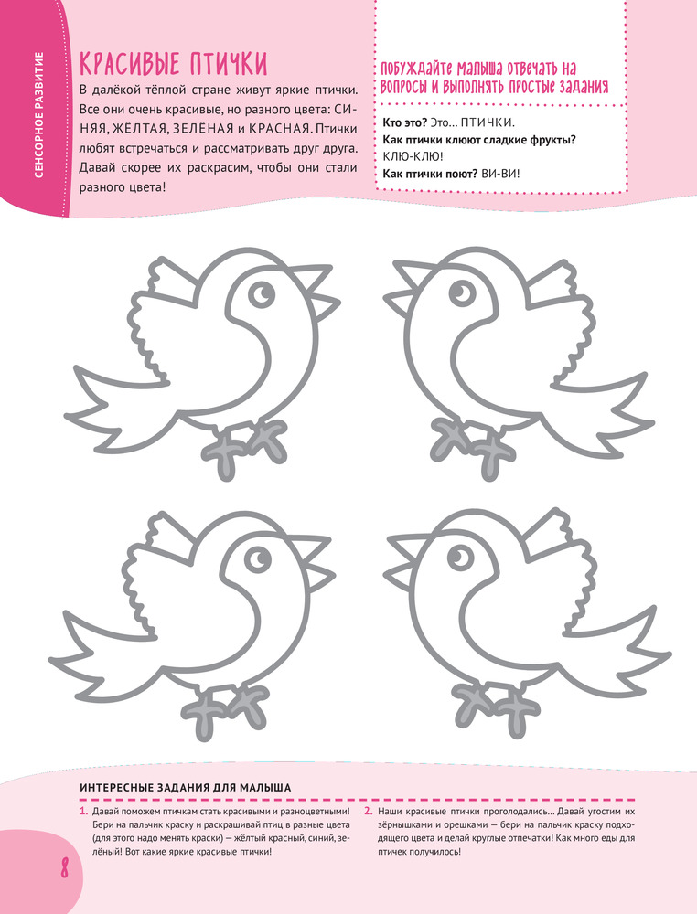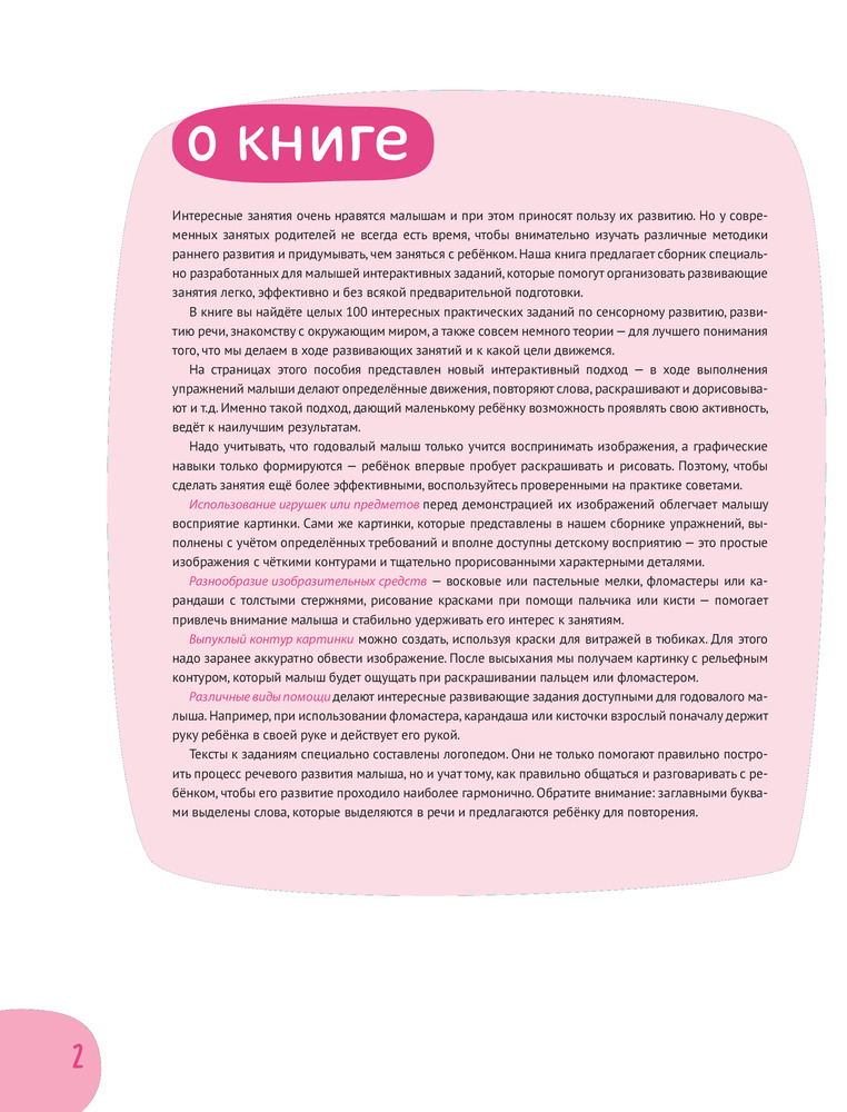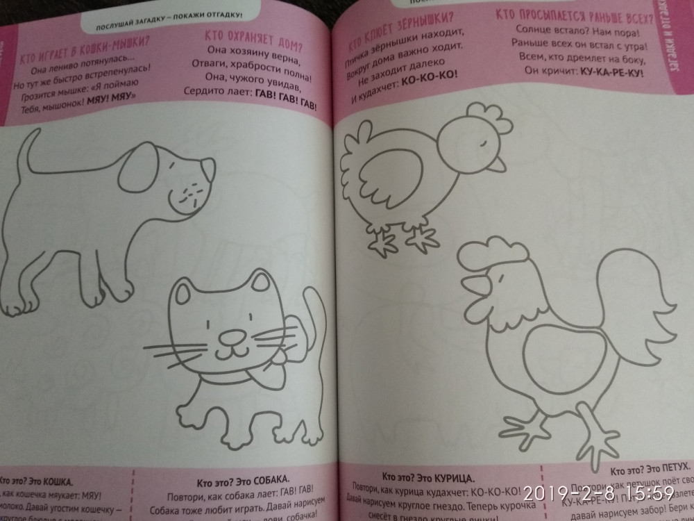 Пособие интересное. Наверное можно заниматься и с года, но нам уже 2,2 а задания актуальны. Когда заказывала, не видела, что есть ещё и пособие от 2 лет. Сначала хотела сделать перезаказ, но посмотрела на содержание и решила оставить. Пособие затрагивает многие темы:цвета, формы, понятия один и много, большой и маленький,мамы животные и дети. Большой раздел направлен на развитие речи. Ну и конечно же каждая страница это разукрашка. Потом наверное эти картинки можно будет использовать для оттачивания навыков вырезания. Дополню фото, кому интересно.
