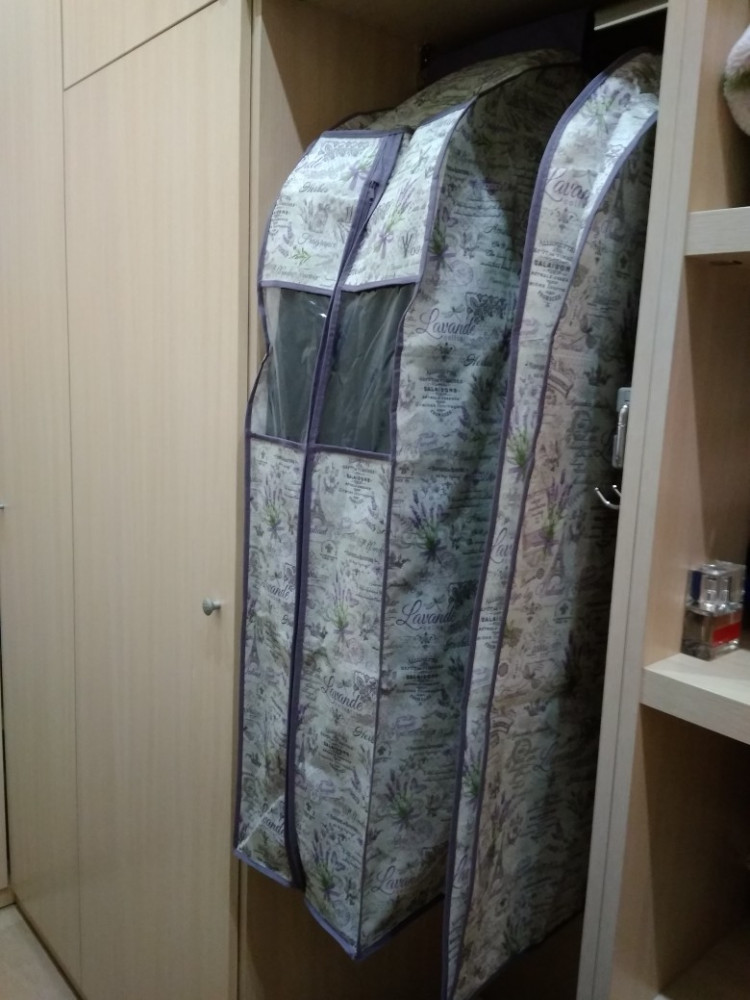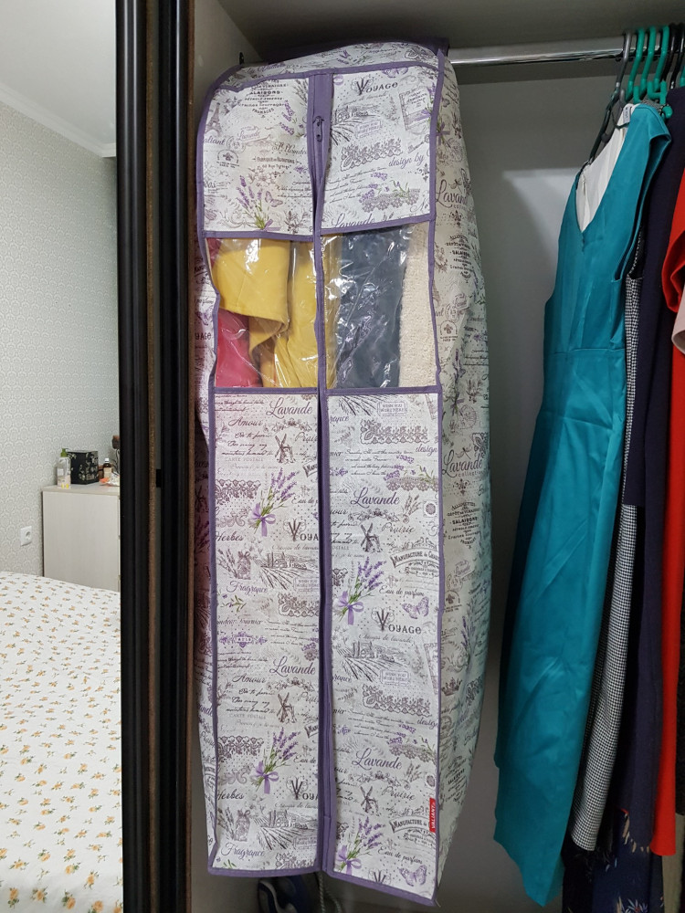 Очень понравился чехол, в него вместилось довольно много трикотажных вещей, которые необходимо убрать на лето. Удобная вешалка. Застегивается на липучку - не будет попадать пыль. И приятный внешний вид. Рекомендую.