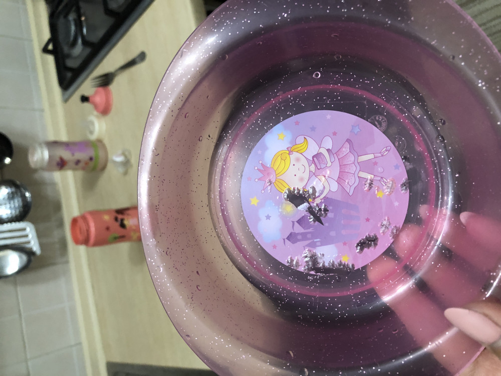 Небольшая. Немного не соответствует цвет. У нас фиолетовая, на самом деле она бледно сиреневая. Не такая яркая как на фото. Картинка принцессы тоже бледновата. В остальном нормально.