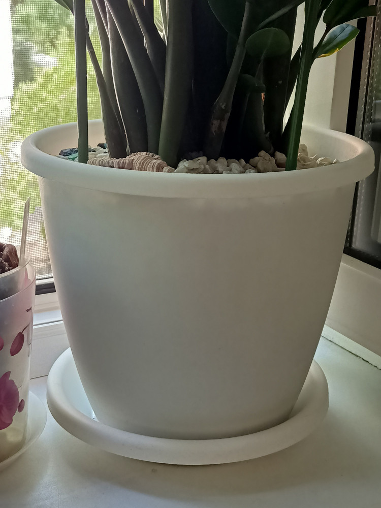 Большой горшочек хорошего качества по приемлемой цене. Есть 3 небольших уже прорезанных отверстия на донышке и поддончик глубокий - всё отлично, спасибо👍🏻
