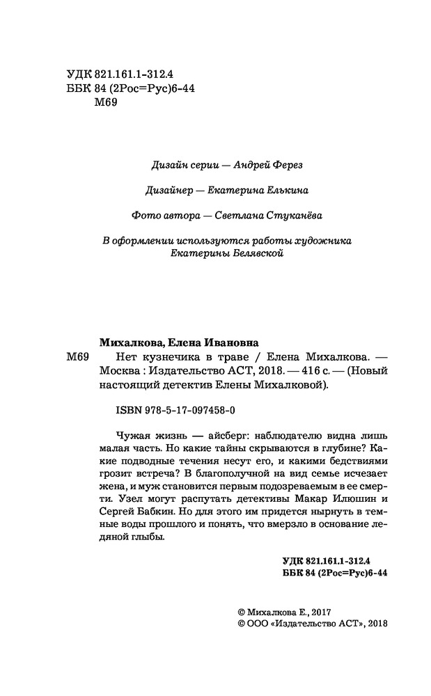 В данный момент этот товар отсутствует в продаже. Возможно, у нас найдется аналогичный или похожий товар  здесь. Серия: Новый настоящий детектив Елены Михалковой Чужая жизнь — айсберг: наблюдателю видна лишь малая часть. Но какие тайны скрываются в глубине? Какие подводные течения несут его, и какими бедствиями грозит встреча? В благополучной на вид семье исчезает жена, и муж становится первым подозреваемым в ее смерти. Узел могут распутать детективы Макар Илюшин и Сергей Бабкин. Но для этого им придется нырнуть в темные воды прошлого и понять, что вмерзло в основание ледяной глыбы.  |
