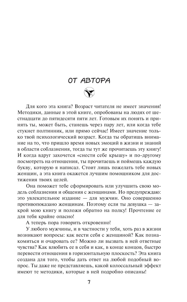 Достоинств в этой книге, как и в полезности автора, нет. Книга для несостоявшихся жалких мужиков. Нормальный мужчина не задается целью затащить в постель как можно большее количество женщин и оставить столько же разбитых сердец. И как нормальный мужчина должен понимать, что завтра и с его дочерью так поступят. Прочла, чтобы научить свою дочь разбираться как ведет себя нормальный мужчина и сосунрк, которому мать недодала нормальной материнской любви, или которого опускали ниже плинтуса одноклассницы, соседки итп.