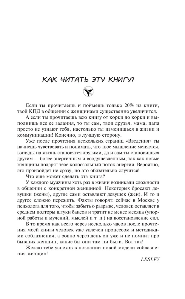 Алекс Лесли действительно мастер пикапа, причем один из лучших. Большинство его манипуляций, техник и уловок работают. Никто с этим не поспорит. Я сам проверял их, причем через день после получения книги, и они функционируют на пять с плюсом. Вопрос заключается в другом, какая польза от его трудов обществу и развитию личности? Что несёт его система в массы? А несёт она беспринципность, анархию, аморальный практицизм, упрощение человеческих отношений, бездуховность, механический, животный взгляд на социум и потворство низшим человеческим инстинктам. Я уверен, что книжка попадает в руки чаще всего младым, планктонным умам, которые не имеют четких приоритетов по жизни, идеалов, нравственных установок и осознанных устремлений, и это вот играет превентивную роль в воспитании поколения. Я бы не хотел жить рядом с людьми, которые воспитаны книгами Лесли (и для женщин он тоже постарался "сваять" труд), и не хотел бы, чтобы мои дети жили в будущем по таким принципам. Я примерно знаю, что ответил бы Лесли мне: "Он бы мне сказал, что я живу в своем маленьком мирке, не повзрослел и не понял ЖИЗНЬ, что мне внушили родители и школы свод законов и правил, что я застыл и я - окаменелость и прочее бла-бла-бла". Но ведь это не так....Я ещё больший циник, чем он, но разница в том, что я не считаю, что это положительно для нашего мироздания и человечества в целом. А ведь такие книги, как работа Лесли, словно зараза, захватывают умы молодёжи. Этот мир прогнил донельзя, а Лесли хочет стать адептом того, что окончательно похоронит его. Кстати, эти техники сработают примерно на 95 процентов девушек, НО... опять это но. Но не на те 5 процентов, которые имеют стержень внутри, идеалы, принципы, глубокий и богатый духовный мир, своё необычное мировоззрение, свод этических ценностей, самоуважение, самобытную индивидуальность и сильную личность.