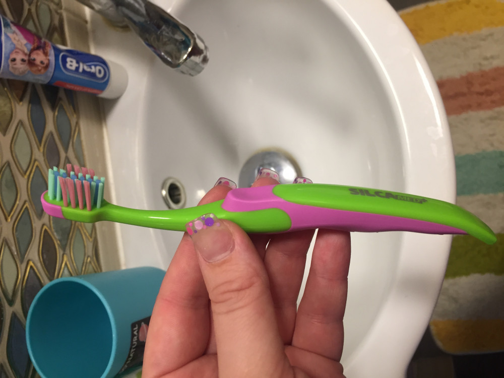 Жестковата, если в горячей воде перед использованием промыть, то мягче становятся щетинки, поглубже чистить зубки неудобно, головка щетки большая, ротик миниатюрный