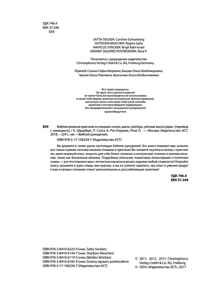 Библия вязания крючком и спицами. Носки, шали, свитера, уютные аксессуарыВ данный момент этот товар отсутствует в продаже. Возможно, у нас найдется аналогичный или похожий товар здесь. Серия: Библия рукоделия Эта книга представляет собой удобный и полный справочник по вязанию для рукодельниц разного уровня мастерства. Она поможет начинающим вязальщицам освоить все необходимые техники вязания спицами и крючком с нуля. А опытные рукодельницы смогут открыть для себя новые интересные техники и приемы вязания. Руководствуясь пошаговыми иллюстрациями, понятными схемами и полезными советами, человек, купивший эту книгу, за короткое время сможет освоить ремесло изготовления ручного трикотажа, а также научиться вязать изделия любой сложности. |