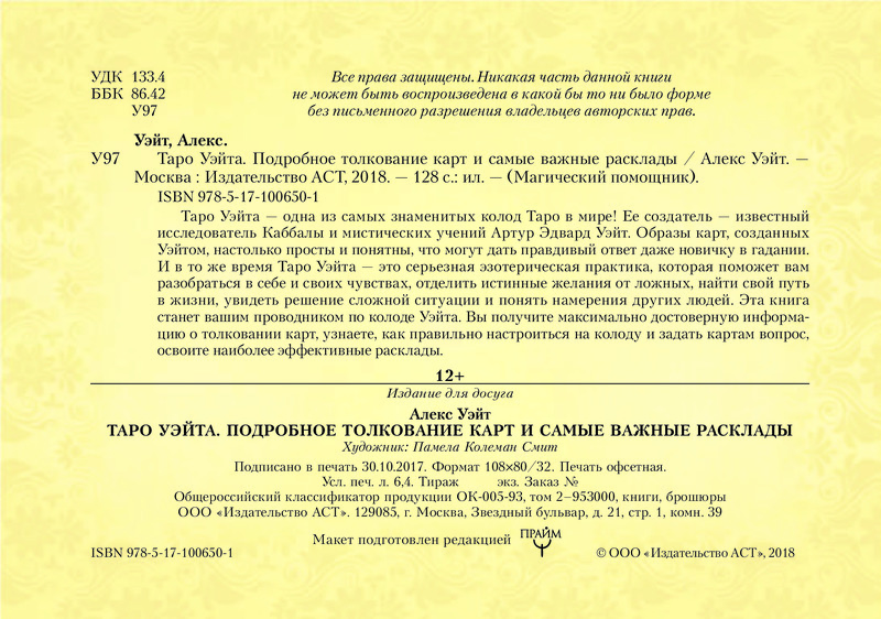 Таро Уэйта. Подробное толкование карт и самые важные раскладыВ данный момент этот товар отсутствует в продаже. Возможно, у нас найдется аналогичный или похожий товар здесь. Серия: Магический помощник Таро Уэйта — одна из самых знаменитых колод Таро в мире! Ее создатель — известный исследователь Каббалы и мистических учений Артур Эдвард Уэйт. Образы карт, созданных Уэйтом, настолько просты и понятны, что могут дать правдивый ответ даже новичку в гадании. И в то же время Таро Уэйта — это серьезная эзотерическая практика, которая поможет вам разобраться в себе и своих чувствах, отделить истинные желания от ложных, найти свой путь в жизни, увидеть решение сложной ситуации и понять намерения других людей. Эта книга станет вашим проводником по колоде Уэйта. Вы получите максимально достоверную информацию о толковании карт, узнаете, как правильно настроиться на колоду и задать картам вопрос, освоите наиболее эффективные расклады. |