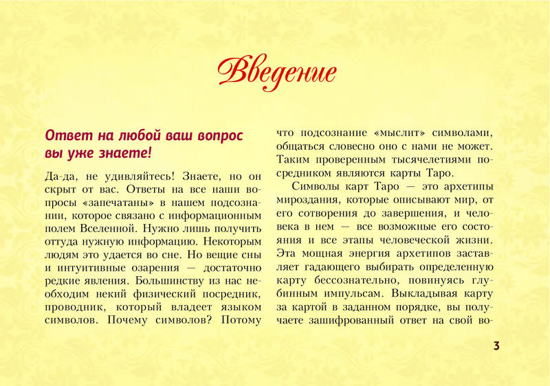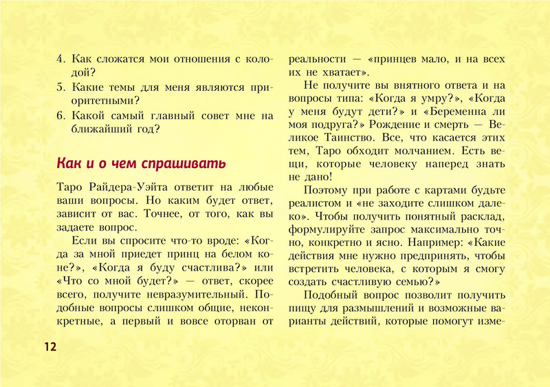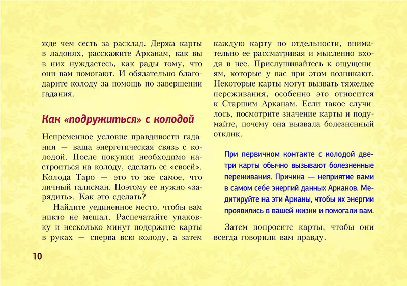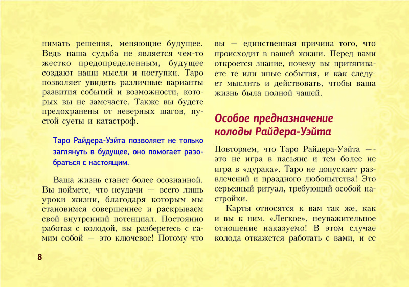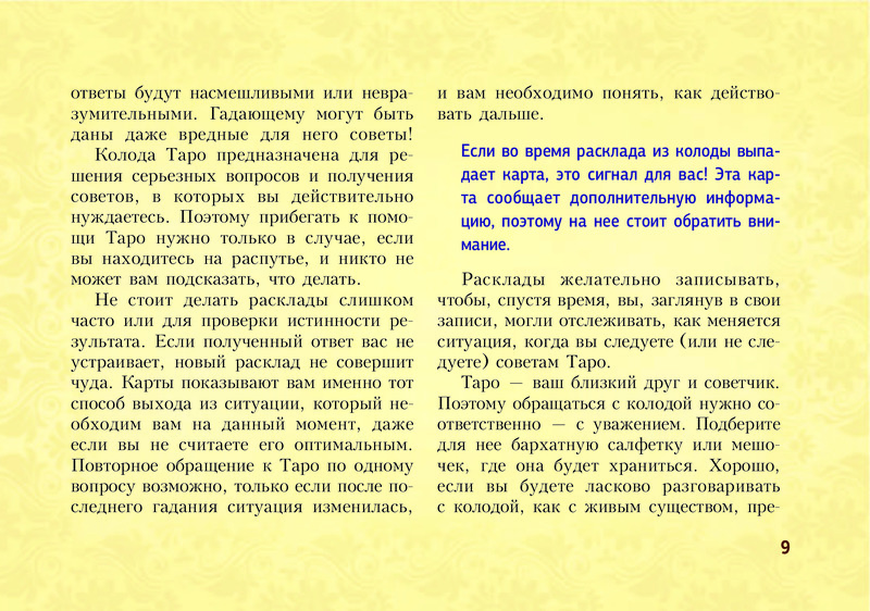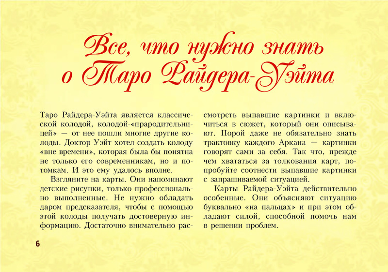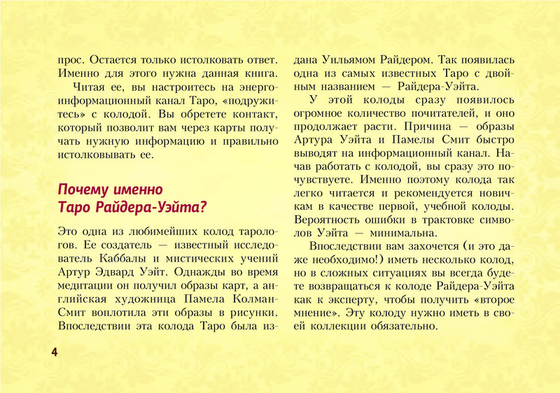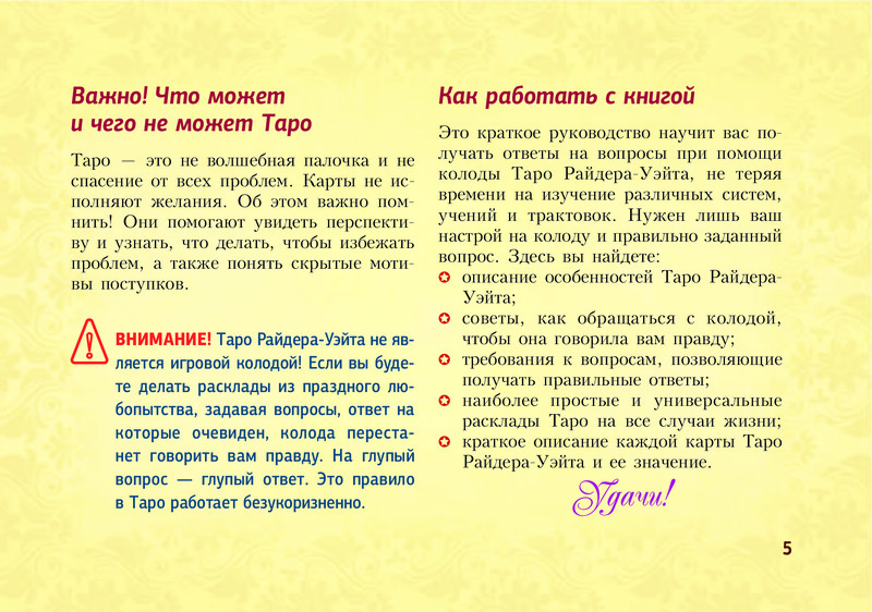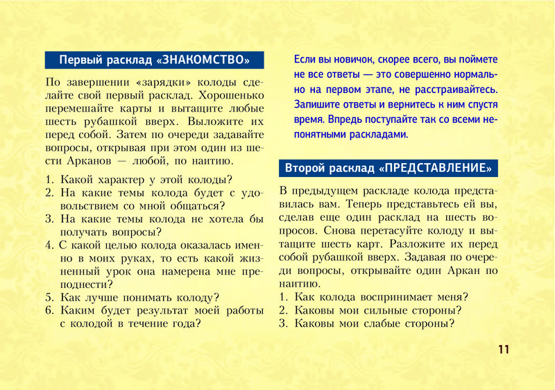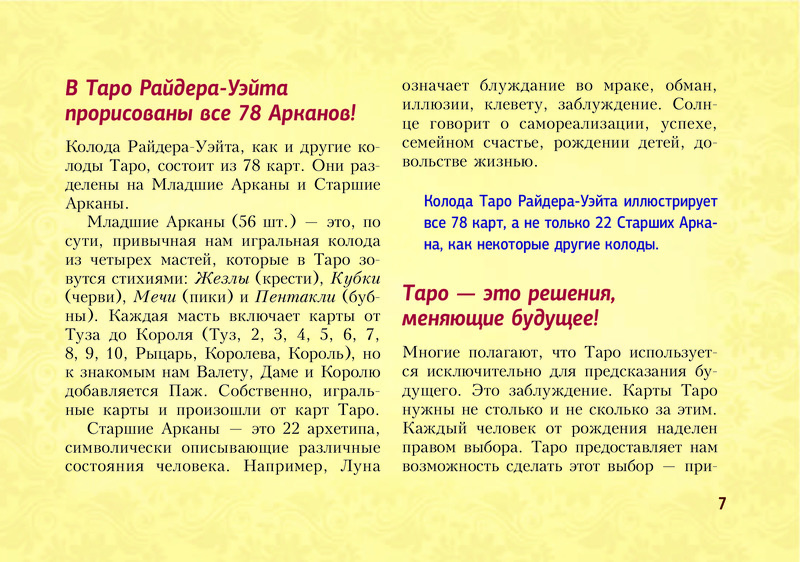 Отличное издание! Выполнено в виде блокнота, удобно пользоваться и брать с собой. Лаконично даны значения всех арканов, доступно и понятно. Много раскладов на различные темы. Рекомендую.