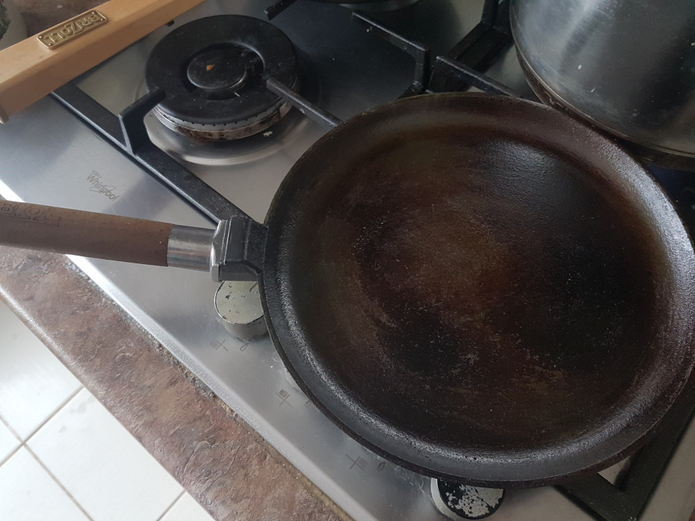 Сковорода лично для меня размер само то. Помыла ее, прогрела с солью, натерла льняным маслом (не подсолнечным как многие пишут) и в духовку на 30 мин при температуре 250. Еще раз намазала маслом и еще раз в духовку до полного остывания. И сразу блинчики жарить. Ничего не прилипло один раз только масло подсолнечное капнула. Приятная на руку посуда.