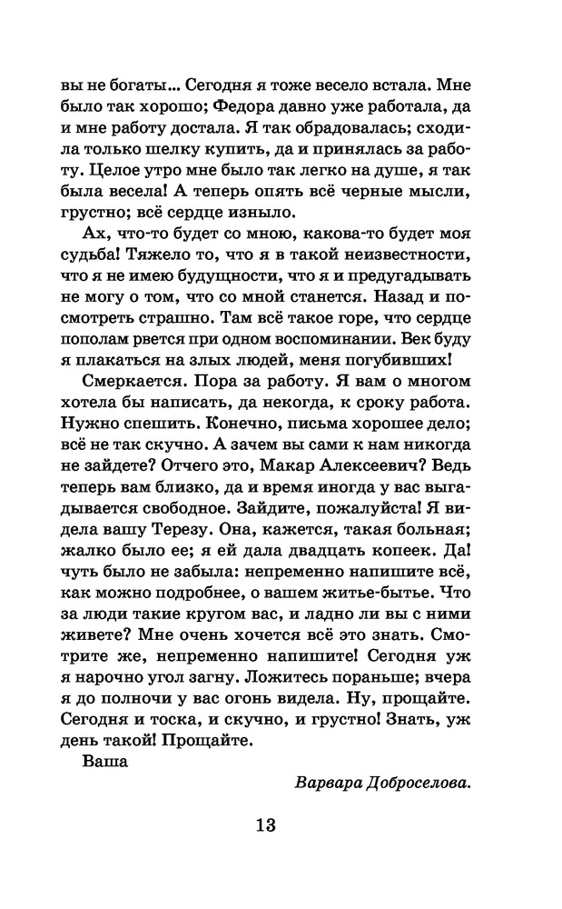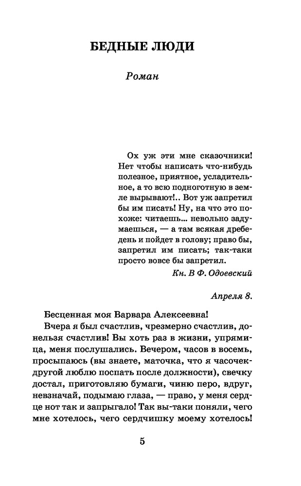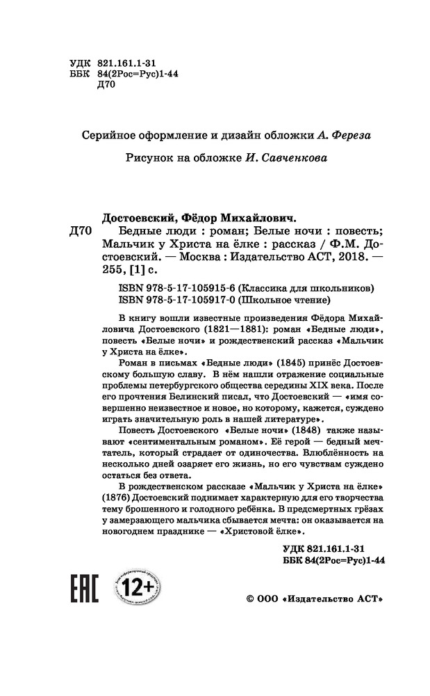 Серия: Школьное чтение В книгу входят известные произведения Фёдора Михайловича Достоевского (1821-1881): роман «Бедные люди», повесть «Белые ночи» и рождественский рассказ «Мальчик у Христа на ёлке». Роман в письмах «Бедные люди» (1845) принёс Достоевскому большую славу. В нём нашли отражение социальные проблемы петербургского общества середины XIX века. После его прочтения Белинский писал, что Достоевский — «имя совершенно неизвестное и новое, но которому, кажется, суждено играть значительную роль в нашей литературе». Повесть Достоевского «Белые ночи» (1848) также называют «сентиментальным романом». Её герой — бедный мечтатель, который страдает от одиночества. Влюблённость на несколько дней озаряет его жизнь, но его чувствам суждено остаться без ответа. В рождественском рассказе «Мальчик у Христа на ёлке» (1876) Достоевский поднимает характерную для его творчества тему брошенного и голодного ребёнка. В предсмертных грёзах у замерзающего мальчика сбывается мечта: он оказывается на новогоднем празднике — «Христовой ёлке». |