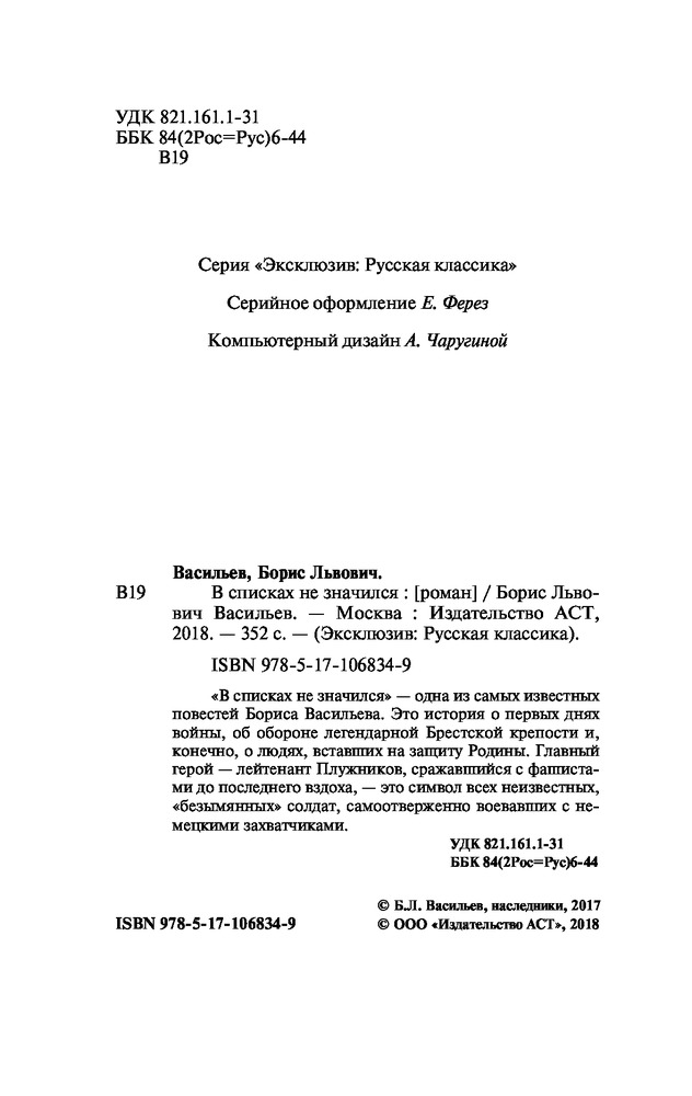 💳 Оплатить за товар можно при получении 🇰🇿 Есть бесплатная доставка по Казахстану 🎁 Копите бонусы с каждой покупки Серия: Эксклюзив: Русская классика «В списках не значился» — одна из самых известных повестей Бориса Васильева. Это история о первых днях войны, об обороне легендарной Брестской крепости и, конечно, о людях, вставших на защиту Родины. Главный герой — лейтенант Плужников, сражавшийся с фашистами до последнего вздоха, — это символ всех неизвестных, «безымянных» солдат, самоотверженно воевавших с немецкими захватчиками. |