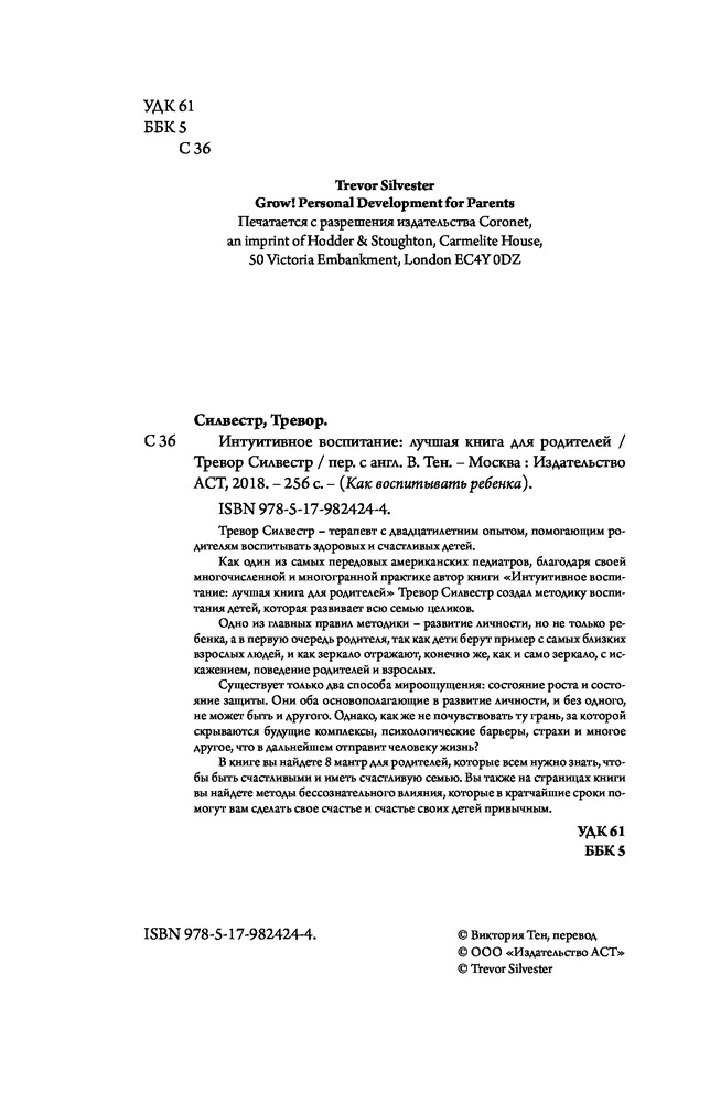 Интуитивное воспитание: лучшая книга для родителейВ данный момент этот товар отсутствует в продаже. Возможно, у нас найдется аналогичный или похожий товар здесь. Серия: Звезда Рунета Тревор Сильвестер — терапевт с двадцатилетним опытом, помогающим родителям воспитывать здоровых и счастливых детей. Как один из самых передовых американских педиатров, благодаря своей многочисленной и многогранной практике автор книги «Интуитивное воспитание: лучшая книга для родителей» Тревор Сильвестер создал методику воспитания детей, которая развивает всю семью целиком. |