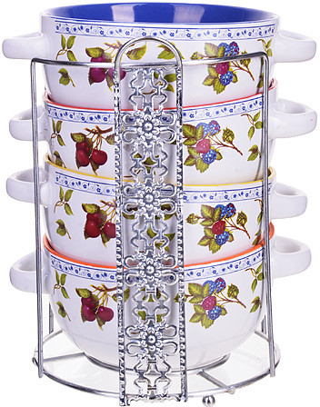 Mayer & Boch Набор супниц на подставке (5 предметов, 540 мл)В данный момент этот товар отсутствует в продаже. Возможно, у нас найдется аналогичный или похожий товар здесь. Набор из 4-х супниц LORAINE выполнен из высококачественной керамики и украшен декоративным рисунком. Супницы компактно располагаются на оригинальной подставке из нержавеющей стали и не занимают много места при хранении. В керамической посуде блюда сохраняют свои вкусовые качества, кроме того она обладает термической и химической прочностью. Благодаря оригинальному дизайну, такие супницы отлично подойдут как для ежедневного использования, так и для праздничной сервировки стола. Изделия оснащены двумя удобными ручками. В наборе: 4 супницы, 1 подставка. |