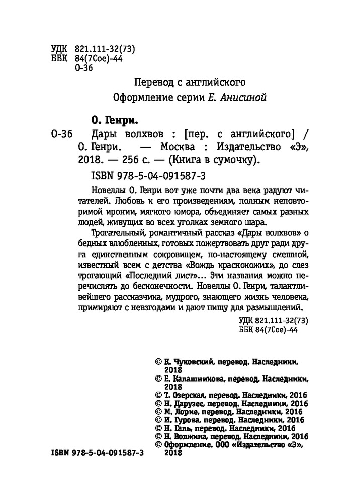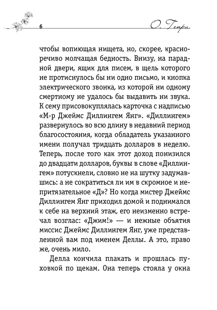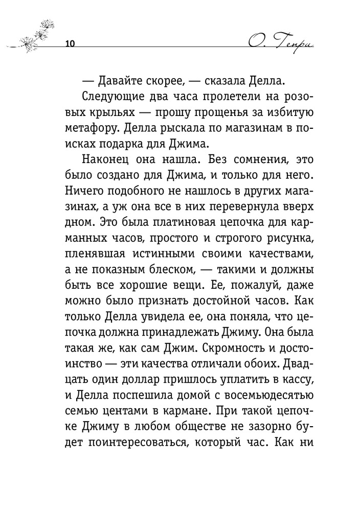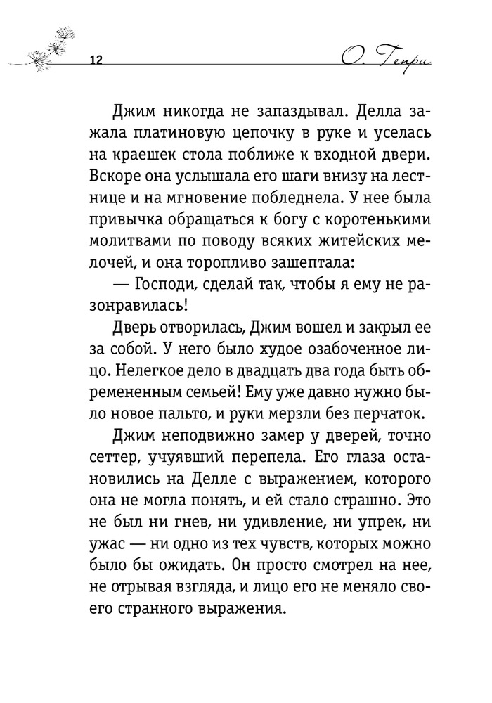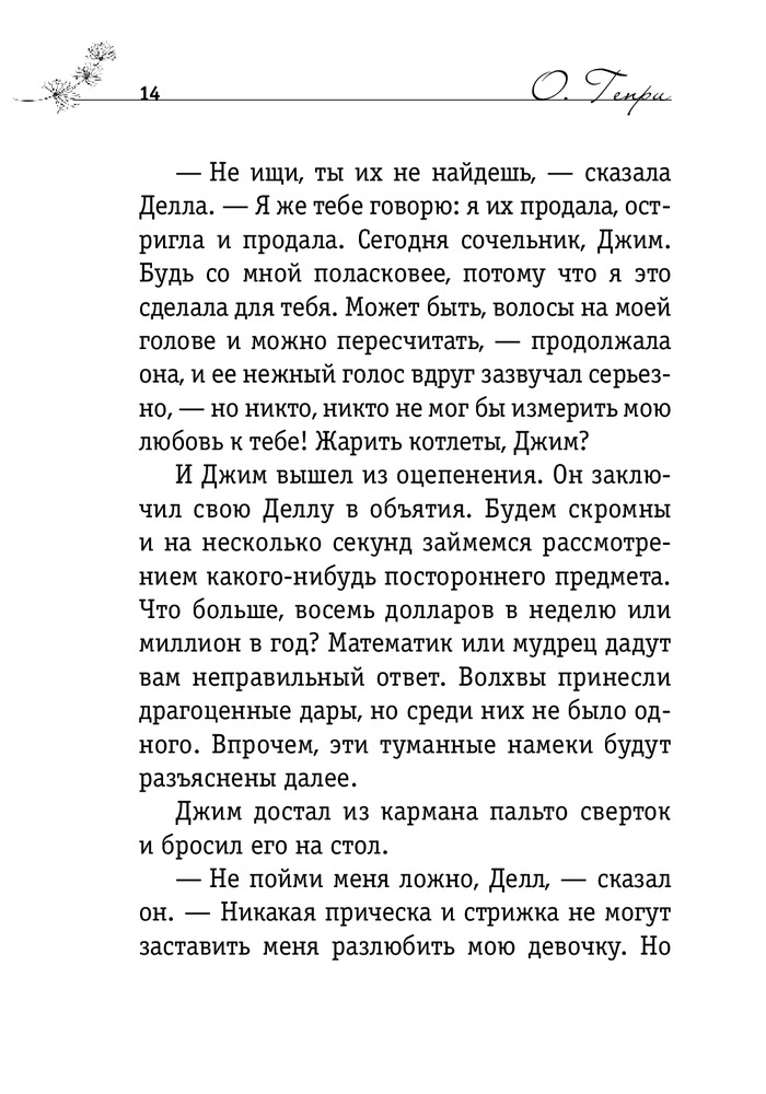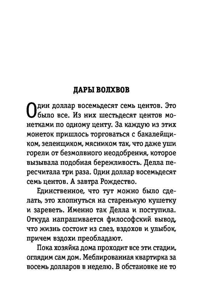 Трогательный, романтичный рассказ «Дары волхвов» о бедных влюбленных, готовых пожертвовать друг ради друга единственным сокровищем, по-настоящему смешной, известный всем с детства «Вождь краснокожих», до слез трогающий «Последний лист»... Эти названия можно перечислять до бесконечности. Новеллы О. Генри, талантливейшего рассказчика, мудрого, знающего жизнь человека, примиряют с невзгодами и дают пищу для размышлений. |