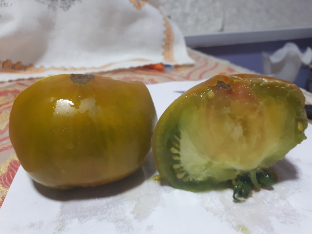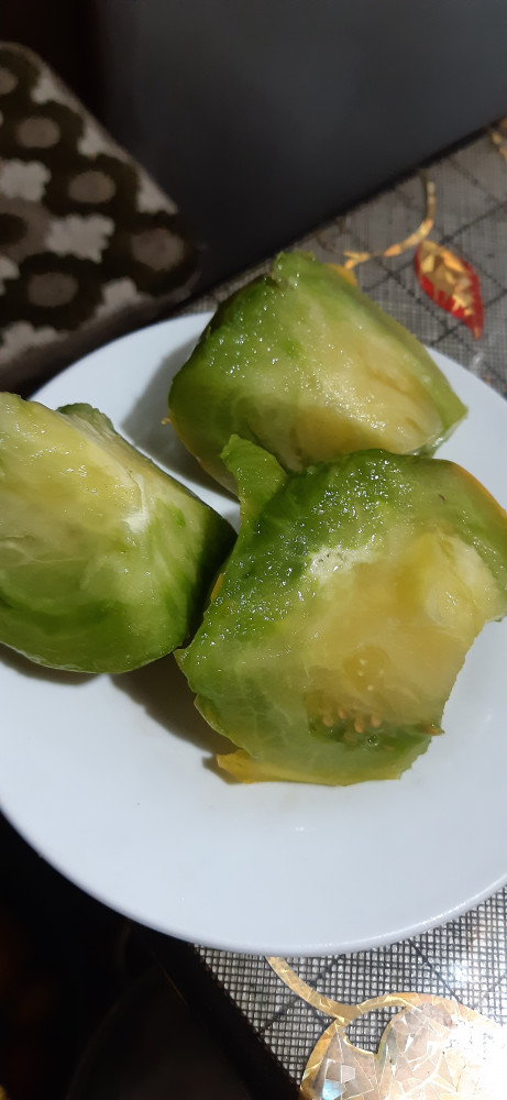 Помидоры очень мясистые, крупные, сладкие. Но цвет помидор необычный, они и внутри зеленые.
