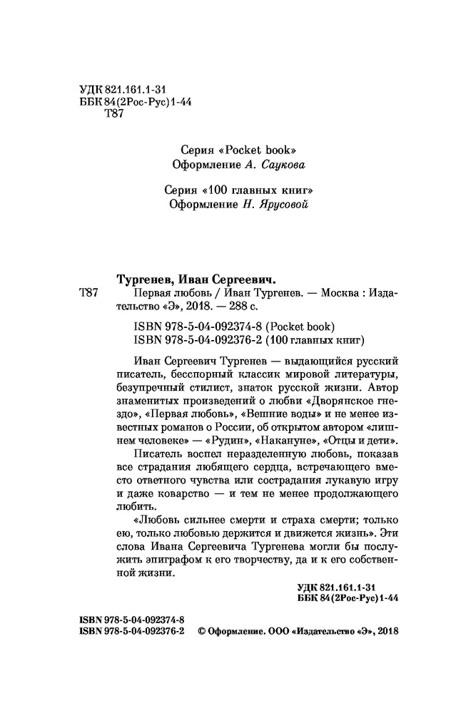 💳 Оплатить за товар можно при получении 🇰🇿 Есть бесплатная доставка по Казахстану 🎁 Копите бонусы с каждой покупки Серия: 100 главных книг (обложка) Иван Сергеевич Тургенев — выдающийся русский писатель, бесспорный классик мировой литературы, безупречный стилист, знаток русской жизни. Автор знаменитых произведений о любви «Дворянское гнездо», «Первая любовь», «Вешние воды» и не менее известных романов о России, об открытом автором «лишнем человеке» — «Рудин», «Накануне», «Отцы и дети». Писатель воспел неразделенную любовь, показав все страдания любящего сердца, встречающего вместо ответного чувства или сострадания лукавую игру и даже коварство — и тем не менее продолжающего любить. «Любовь сильнее смерти и страха смерти; только ею, только любовью держится и движется жизнь». Эти слова Ивана Сергеевича Тургенева могли бы послужить эпиграфом к его творчеству, да и к его собственной жизни. |