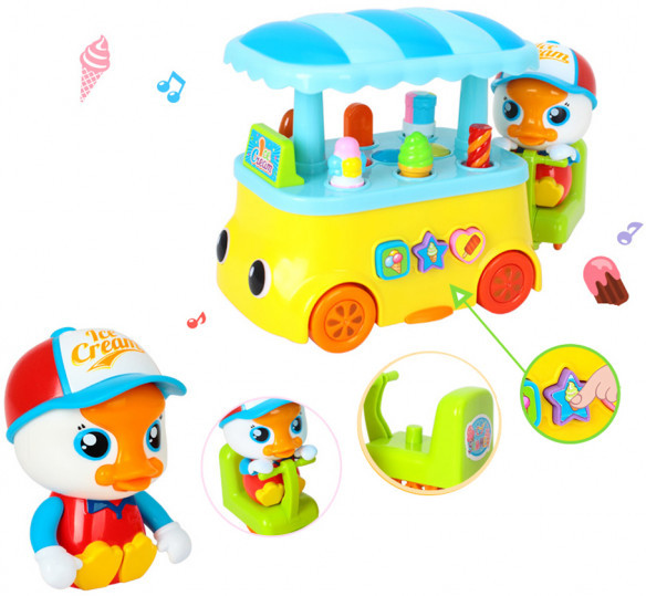 Huile Toys Игрушка «Тележка с мороженным»В данный момент этот товар отсутствует в продаже. Возможно, у нас найдется аналогичный или похожий товар здесь. Симпатичный утенок с удовольствием накормит мороженным всю семью. Красочная тележка мигает огоньками, мороженное можно достать из тележки и поместить обратно. Тележка имеет кнопку включения/выключения и регулировки громкости. Нажимая кнопки на борту тележки малыш познакомится с различными формами. Прицеп с утенком можно отсоединить от тележки и играть отдельно. |