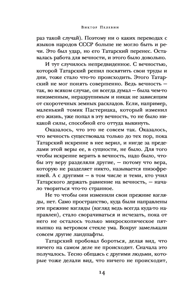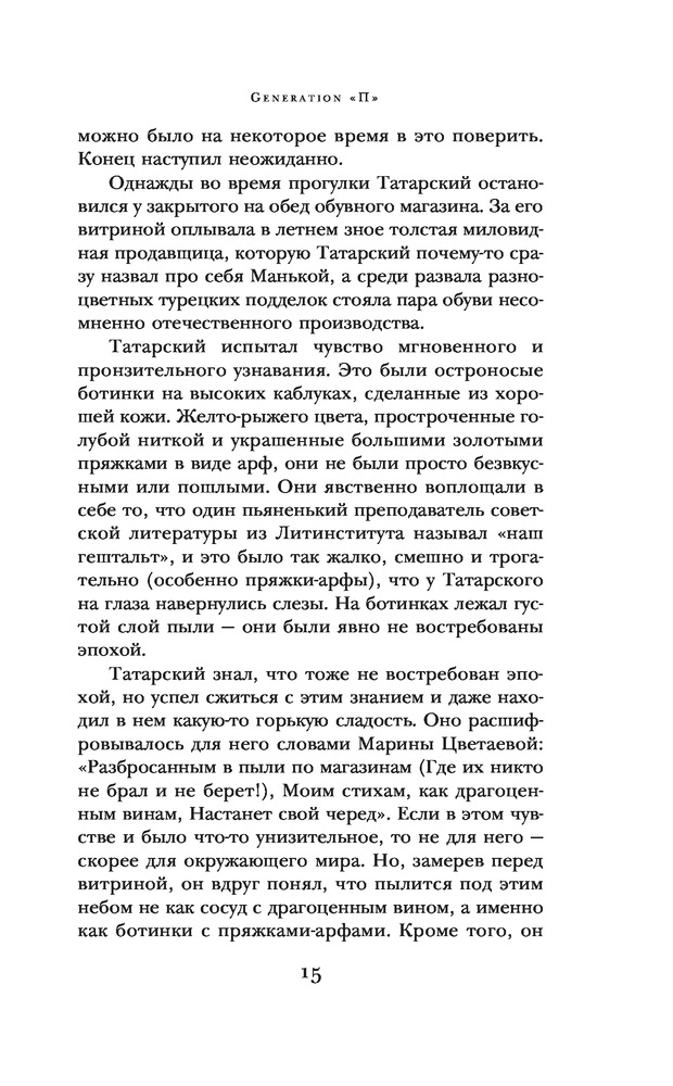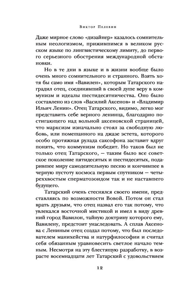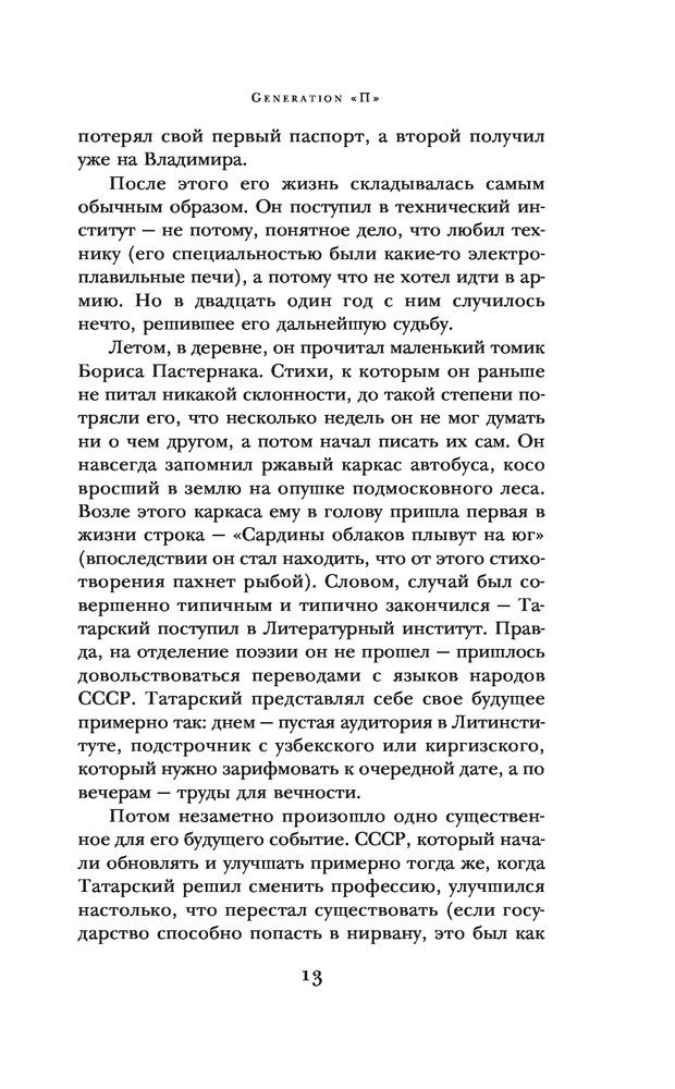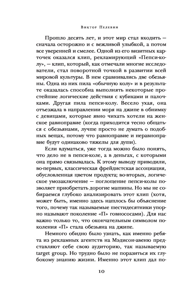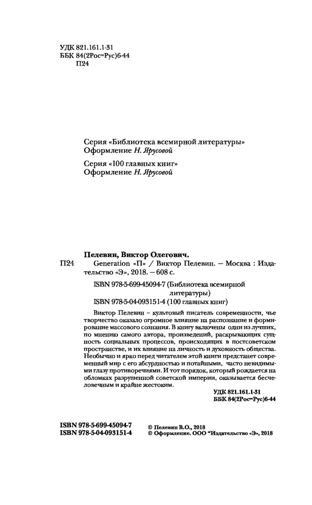 Generation "П"В данный момент этот товар отсутствует в продаже. Возможно, у нас найдется аналогичный или похожий товар здесь. Серия: 100 главных книг Виктор Пелевин — культовый писатель современности, чье творчество оказало огромное влияние на распознание и формирование массового сознания. В книгу включены одни из лучших, по мнению самого автора, произведений, раскрывающих сущность социальных процессов, происходящих в постсоветском пространстве, и их влияние на личность и духовность общества. Необычно и ярко перед читателем этой книги предстанет современный мир с его абсурдностью и потайными, часто невидимыми глазу противоречиями. И тот порядок, который рождается на обломках разрушенной советской империи, оказывается бесчеловечным и крайне жестоким. |