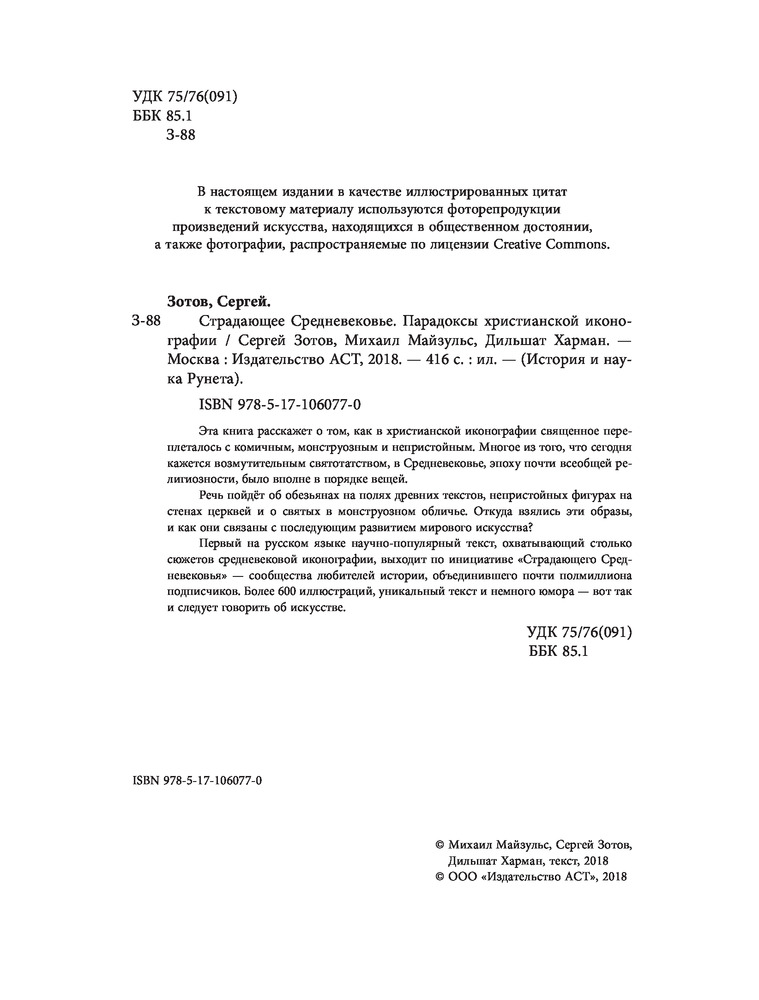 Серия: История и науки Рунета Эта книга расскажет о том, как в христианской иконографии священное переплеталось с комичным, монструозным и непристойным. Многое из того, что сегодня кажется возмутительным святотатством, в Средневековье, эпоху почти всеобщей религиозности, было вполне в порядке вещей. Речь пойдёт об обезьянах на полях древних текстов, непристойных фигурах на стенах церквей и о святых в монструозном обличье. Откуда взялись эти образы, и как они связаны с последующим развитием мирового искусства? Первый на русском языке научно-популярный текст, охватывающий столько сюжетов средневековой иконографии, выходит по инициативе «Страдающего Средневековья» — сообщества любителей истории, объединившего почти полмиллиона подписчиков. Более 600 иллюстраций, уникальный текст и немного юмора — вот так и следует говорить об искусстве. |