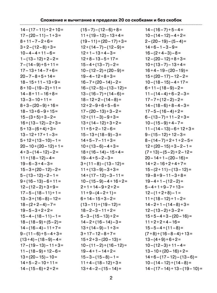 Серия: 3000 примеров В пособии представлен материал, который поможет сформировать навыки устного счета по базовым темам второго класса: «Сложение и вычитание в пределах 20», «Умножение на 2, 3, 4», «Сложение и вычитание круглых чисел», «Сложение и вычитание в пределах 100», «Умножение и деление на числа от 1 до 5», «Умножение и деление на числа от 2 до 9». Отвечая на вопросы учителя к каждому из приведенных примеров, учащиеся выполняют несколько математических заданий — всего более 3000 примеров. |