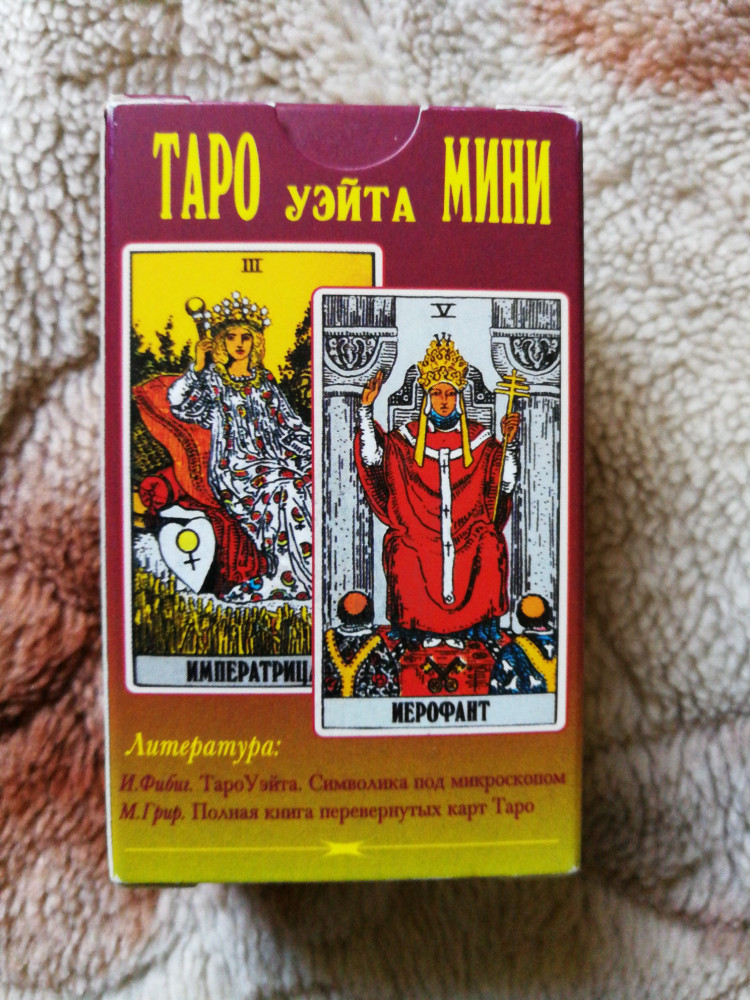Про эти карты ТАРО прочитал в книге Мелисы Сайновой "Простое и понятное руководство ТАРО на все случаи жизни" ( кстати эта книга есть на Флипе, и стоит она не дорого). Автор книги хорошо отзывалась именно об этих картах, а тем более они миниатюрные. Спасибо всем за хорошие отзывы, я постоянно руководствуюсь вашим мнением. Теперь с нетерпением буду ждать поступление товара. У автора книги в наличии 60 колод карт ТАРО. Лично у меня это будет только 2 колода.