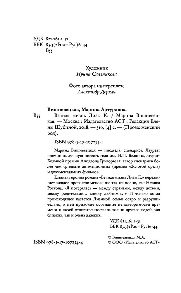 Серия: Проза: женский род Марина Вишневецкая — писатель, сценарист. Лауреат премии им. И.П. Белкина за лучшую повесть года («А.К.С. Опыт любви», 2002), лауреат Большой премии Аполлона Григорьева (2002), автор сценариев более чем 30 анимационных и документальных фильмов. Мультфильм, снятый по ее сказке «Кот и мышь», награжден в 2017 году премией «Золотой орел». Новый роман «Вечная жизнь Лизы К.» отмечен в 2017 году премией журнала «Знамя». Тридцатилетняя героиня романа Лиза Карманникова каждое прожитое мгновение переживает так же полно, как Наташа Ростова. «Я потерялась — между странами, между детьми, между родителями, между тремя языками, летом вдруг показалось, что между любовями...», говорит она о себе. А вокруг — кипит жизнь, незаметно превращаясь в историю. Действие романа разворачивается в 2012–2015-м. Но только когда происходящее касается Лизиной семьи остро и разрушительно, она понимает: человек не может жить только личным. К Лизе приходит осознание неповторимости времени и своей ответственности за жизни других людей, как близких, так и очень далеких. |